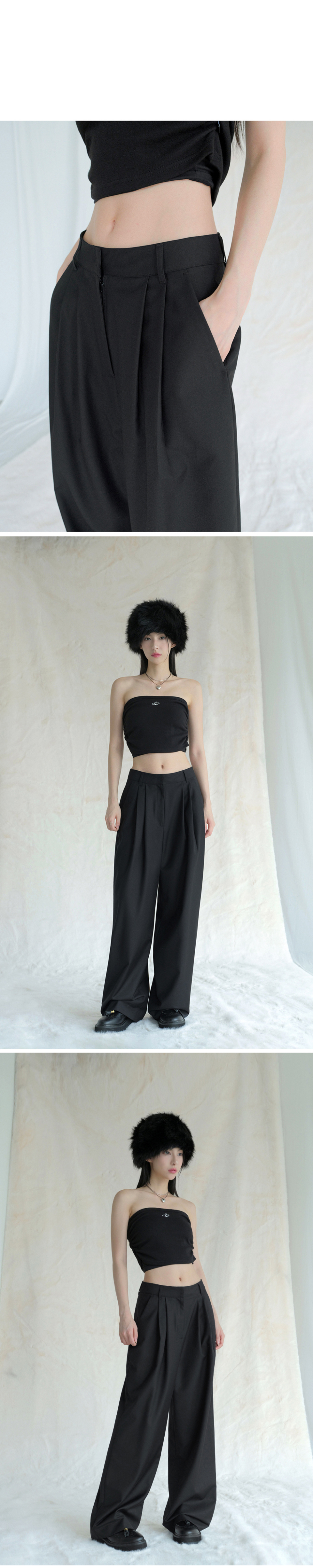 우먼즈 웨이스트 스트랩 딥 턱 와이드 슬랙스 [블랙]