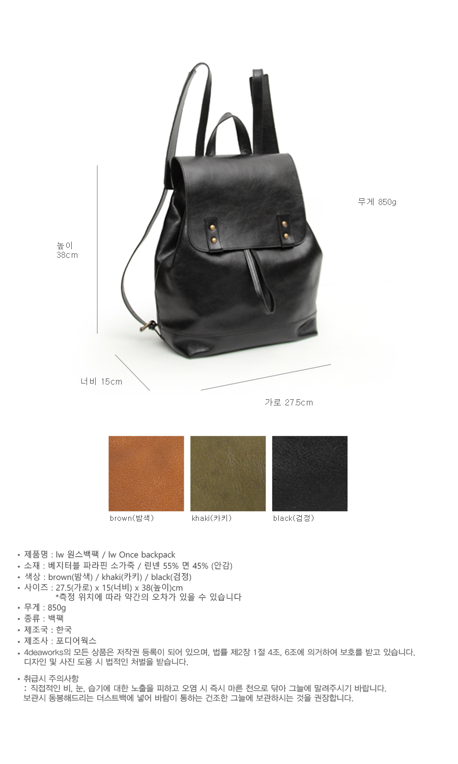 - 가죽이 들어간 제품 특성상 제품 공정시 발생하는 소량의 스크래치나 점, 주름 등은 교환 및 반품 사유가 되지 않습니다.