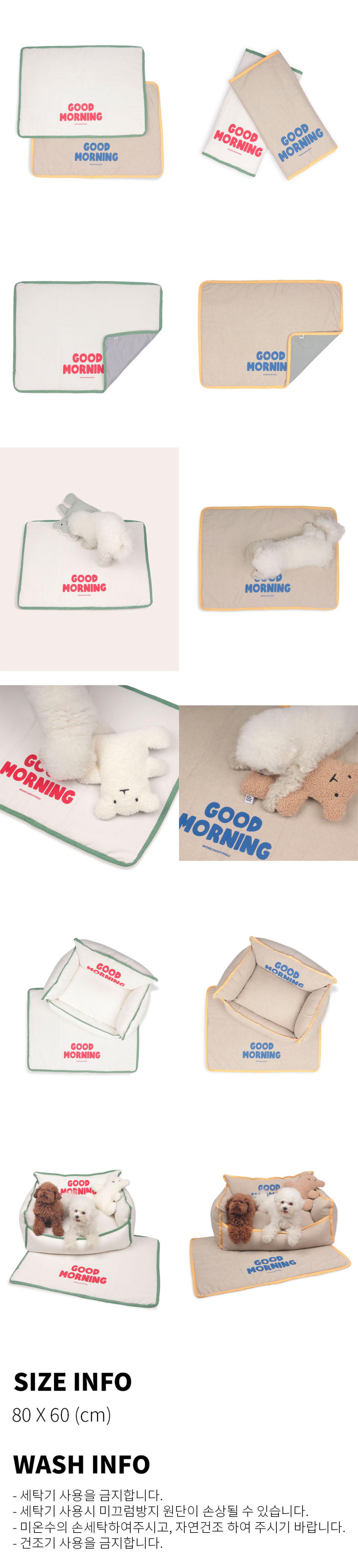 Good Morning Mat 심플한 디자인의 통통튀는 칼라믹스가 매력적인 반려동물용 매트입니다. 멍멍친구들의 쿠션 앞, 쉬는공간, 야외공간 등 유용하게 사용가능합니다. 매트에는 3온스 패딩솜이 들어있어 퐁퐁한 느낌을 주고, 특히 여름철 더위를 많이 타거나 관절이 약한 친구들에게 사용을 추천드립니다. 굿모닝 하우스와 함께 연출하여 주시면 더욱 멋진 공간을 연출할 수 있습니다. - Cotton 100% - Made in Korea