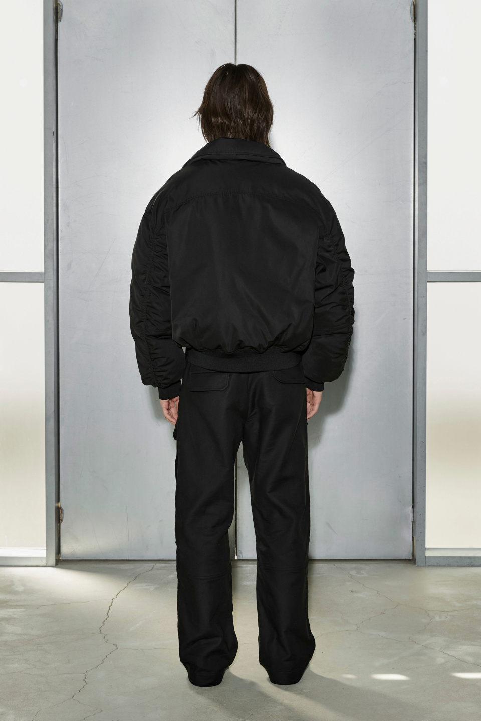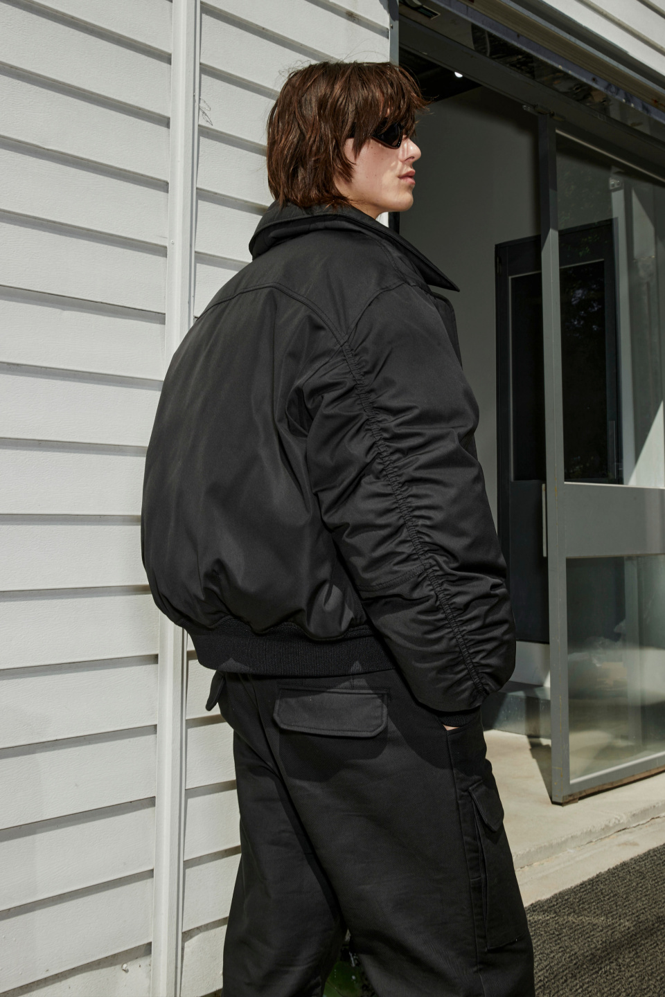 숏한 기장과 볼륨감으로 스타일리시한 실루엣을 완성하며 요크 선과 연결되는 입체적인 소매에 셔링으로 은은한 포인트를 주었습니다.