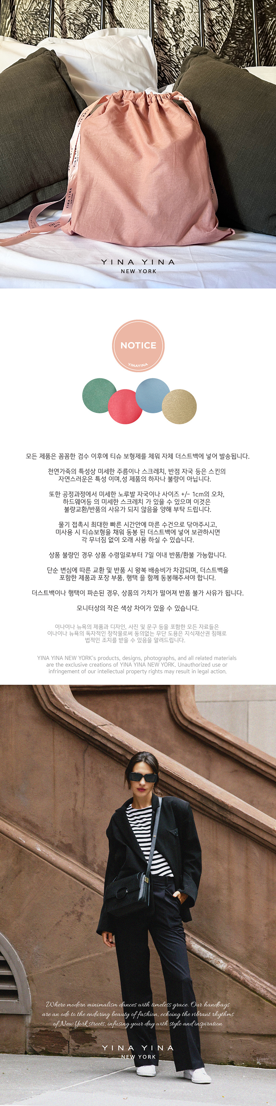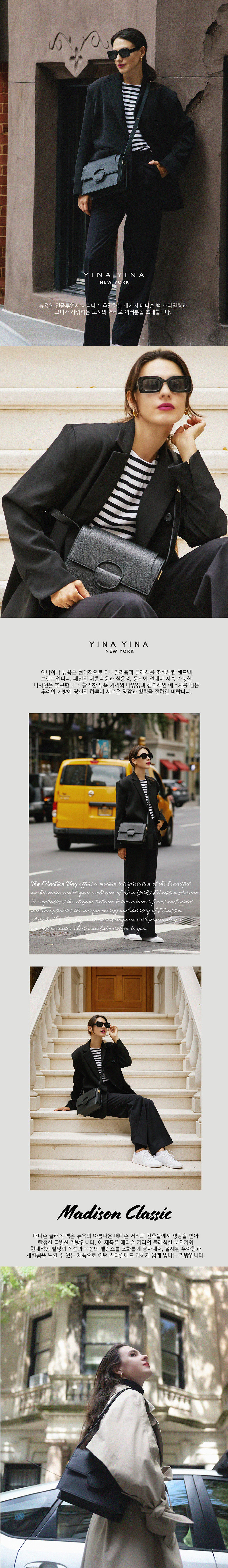 이나이나 뉴욕(YINA YINA NEW YORK)은 현대적인 터치를 바탕으로 미니멀리즘을 재해석하는 핸드백 브랜드입니다. 패션의 미학과 실용적 요구를 충족하며, 지속 가능한 디자인을 연구하고 만들어나가자는 모토로 뉴욕에서 론칭되었습니다. 엄선한 소재와 엄격한 품질 공정을 거쳐 완성한 제품을 합리적인 가격으로 선보입니다.