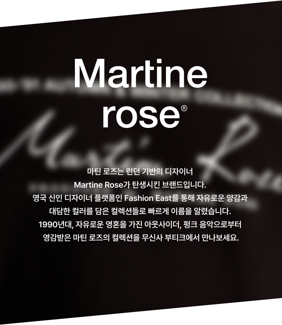 마틴 로즈(MARTINE ROSE)는 런던 기반의 디자이너 Martine Rose가 탄생시킨 브랜드입니다. 영국 신인 디자이너 플랫폼인 Fashion East를 통해 이름을 알렸으며, 자유로운 양감과 대담한 컬러의 뉴트럴한 감성을 담은 컬렉션들로 빠르게 이름을 알린 브랜드입니다. 1990년대, 자유로운 영혼을 가진 아웃사이더, 펑크 음악 등으로부터 영감을 받아 전개하는 마틴 로즈의 컬렉션을 무신사 부티크에서 선보입니다.