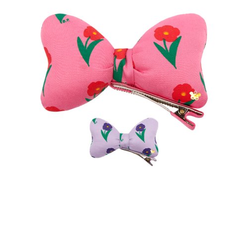 베베드피노의 올 오버 플레르 리본 헤어 핀입니다. Pink, Purple 컬러의 Twill 원단에 베베드피노의 23FW 오브제인 Fleur를 전판 롤 프린팅하여 제작했습니다. 착용하였을 때 고정력이 좋은 집게핀을 이용하여 만들었습니다.