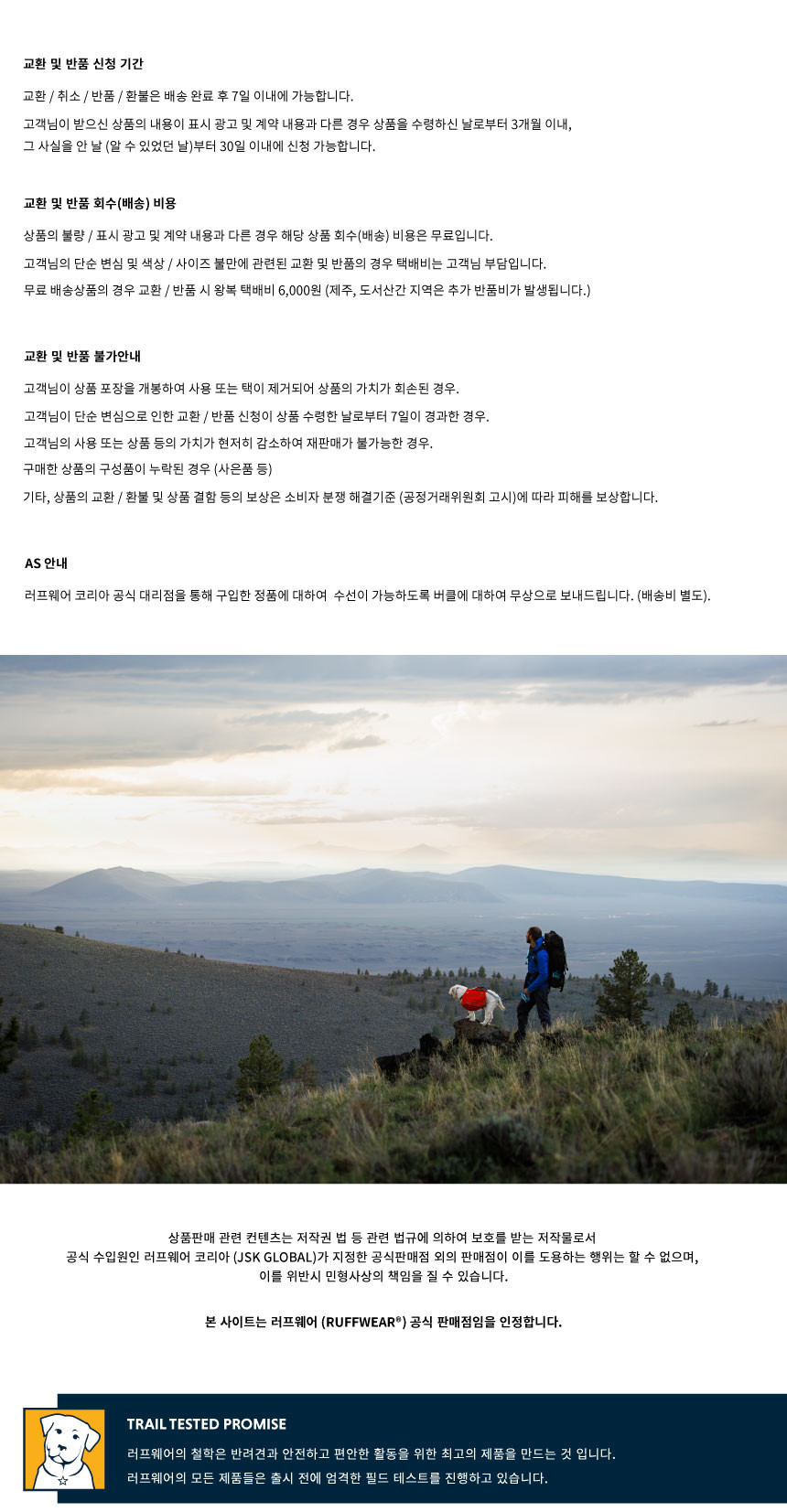러프웨어(RUFFWEAR)는 그 이름만으로도 애견용품을 대표하는 최고급 브랜드로 미국 오리건주 밴드에 위치했습니다. 러프웨어의 철학은 개와 사람이 동료애를 느끼며 아웃도어 활동을 안전하고 편안하게 할 수 있는 최고급 아웃도어 애견용품을 만드는 것이며, 이를 위해 제품의 디자인, 소재를 그 목적에 맞게 설계/제작하고 있으며 지속적인 제품 개발을 통해 최고의 애견용품 업체로의 위상을 굳건해 하고 있습니다.