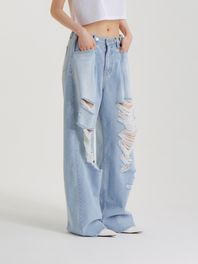 커스텀 원턱 디스트로이드 와이드 데님 팬츠 라이트 인디고