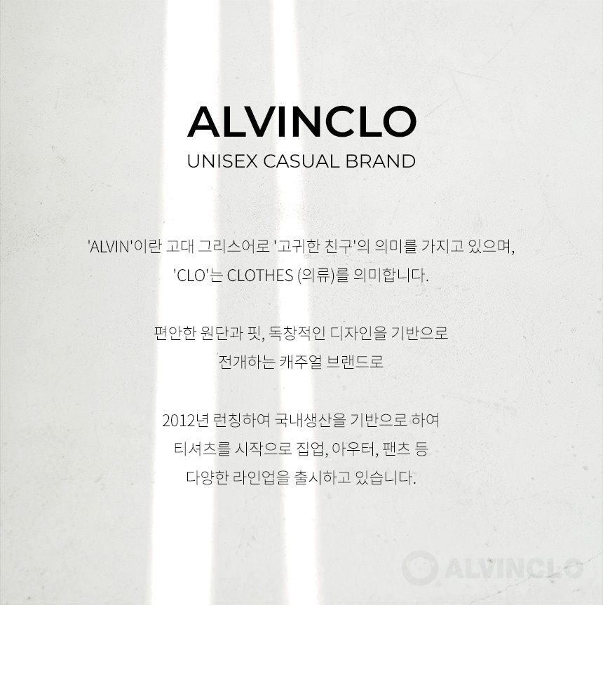 앨빈클로(ALVINCLO)는 '옷을 입는 한 사람'으로서 언제 어디서나 편안하고 트렌디한 옷을 만들기 위해 끊임없이 노력하고 성장하고자 합니다. 다양하게 변화하는 디자인 흐름 속에서 본질에 충실하면서도 유니크한 디자인을 선보입니다. 또한, 론칭 이후 지금까지 국내 원단 사용&생산을 고집하고 있으며 철저한 품질 관리를 통해 눈치채기 힘든 부분까지 디테일하게 관리합니다.