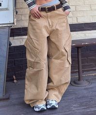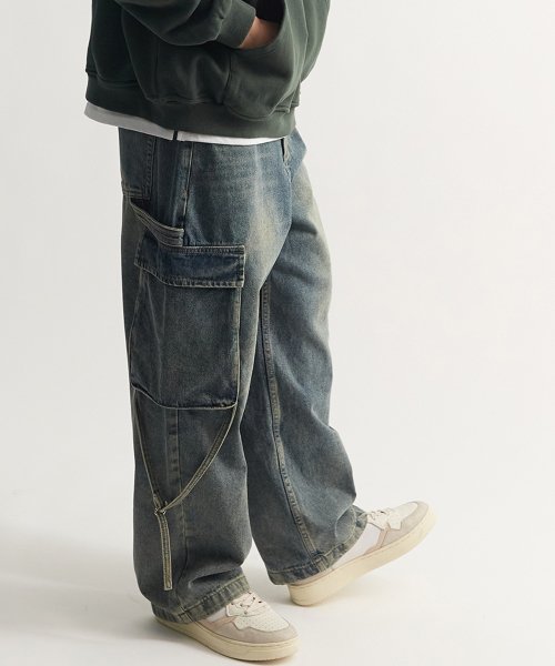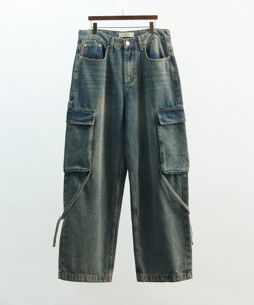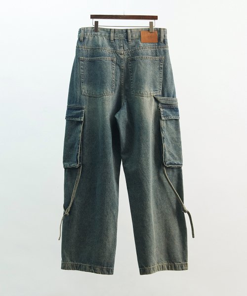 스트랩 워시드 와이드 카고 데님 팬츠
