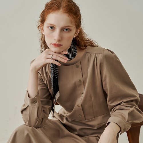 원 사이드 버튼 퍼프 롱 원피스 - 베이지