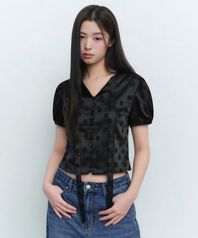 우먼즈 도트 퍼프 슬리브 타이 블라우스 [블랙]