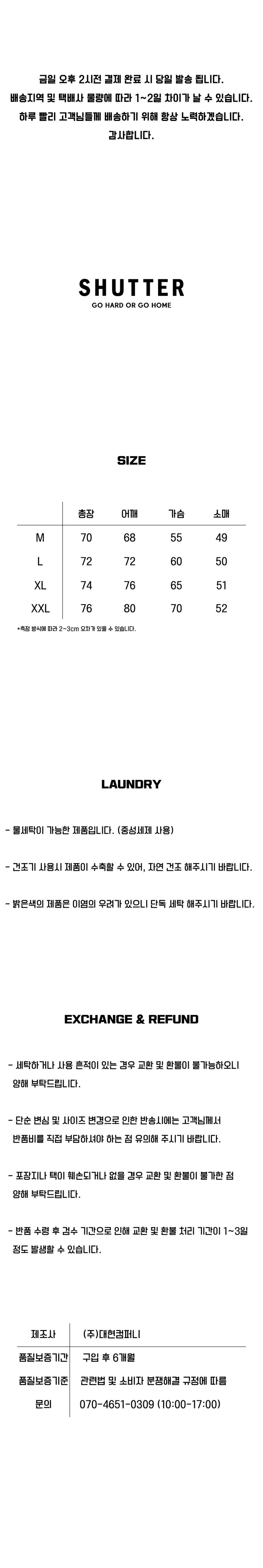SHUTTER(셔터)는 카메라와 동일한 뜻을 의미하며, 'GO HARD OR GO HOME'이라는 슬로건 아래 브랜드를 이끌어 나가고 있습니다. 우리는 반복적이고 지루한 삶 속에 얽매이지 않고 매사에 최선을 다해 의미 있는 기억들을 담아내고자 합니다.