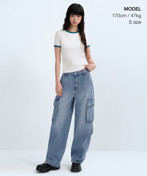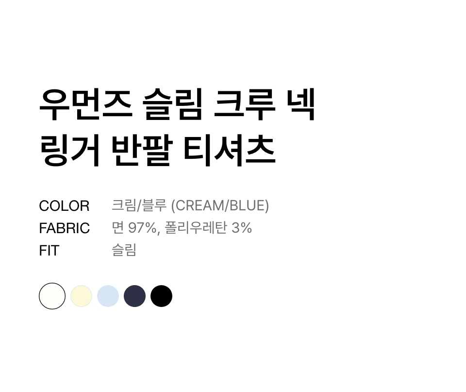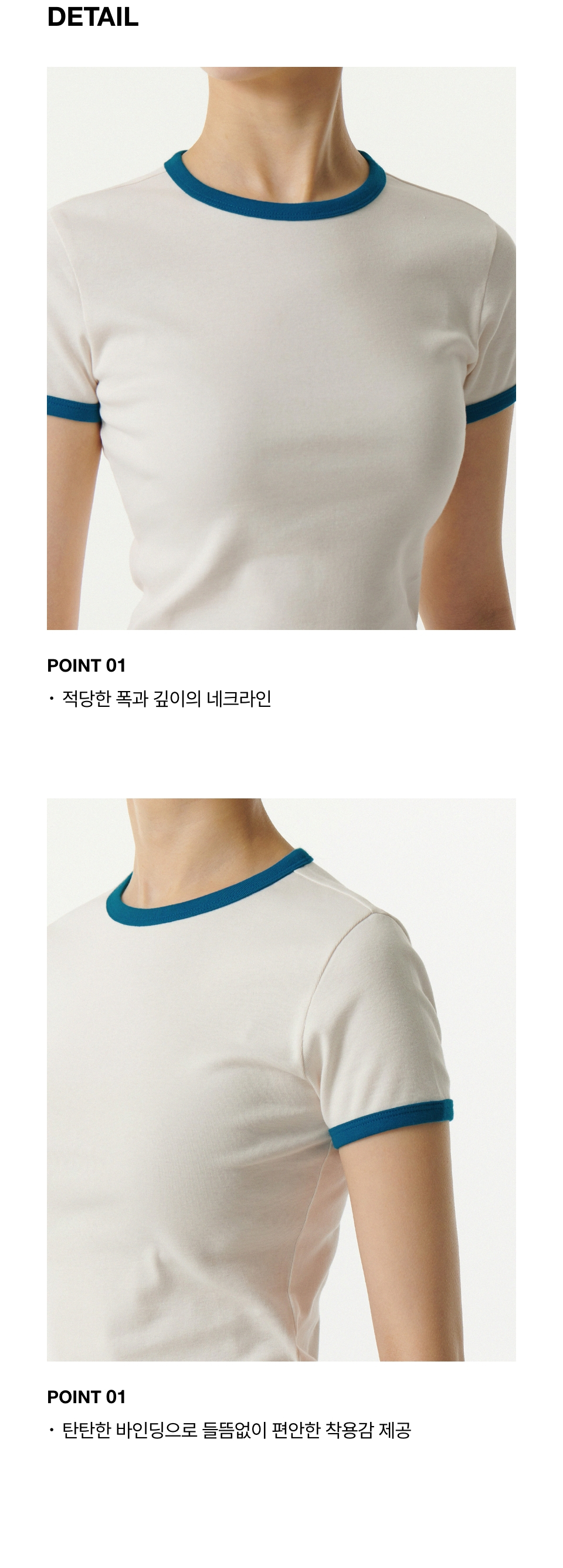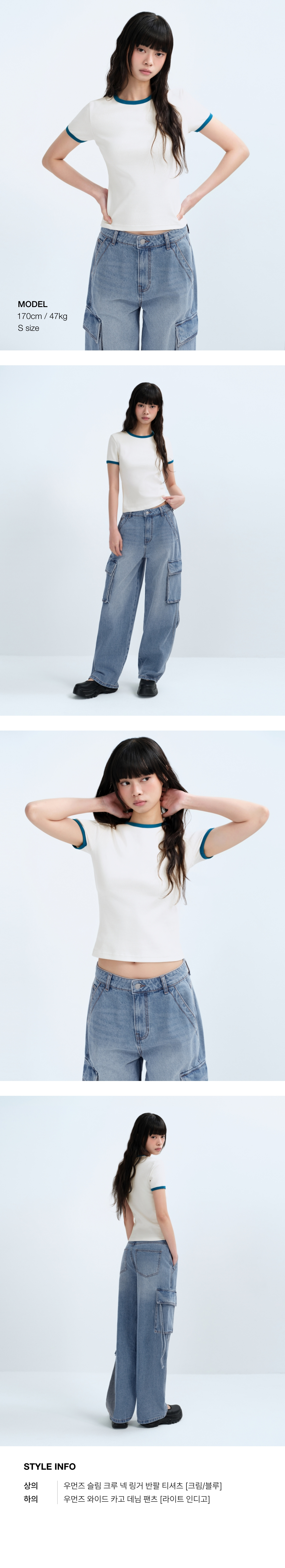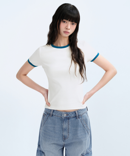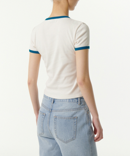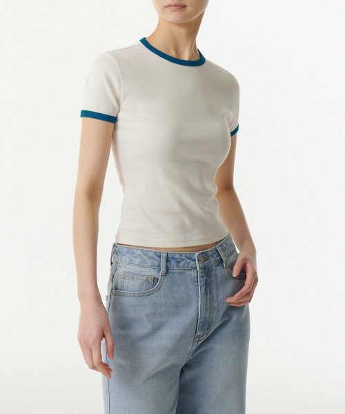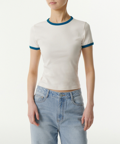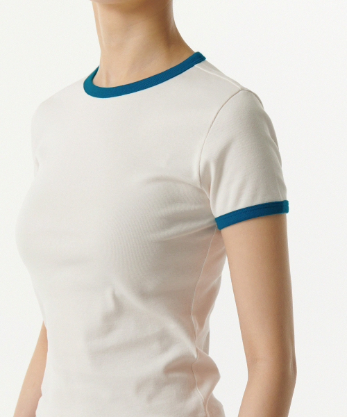 우먼즈 슬림 크루 넥 링거 티셔츠 [크림/블루]
