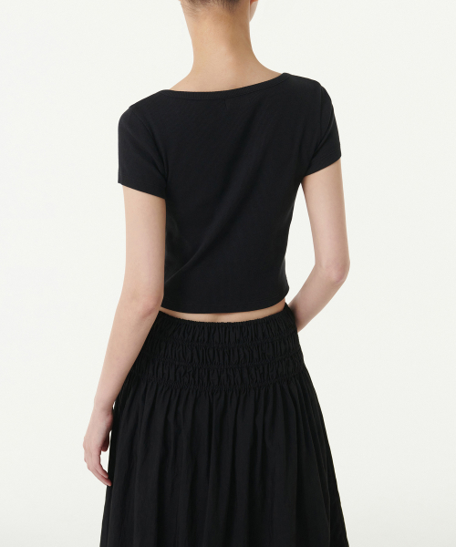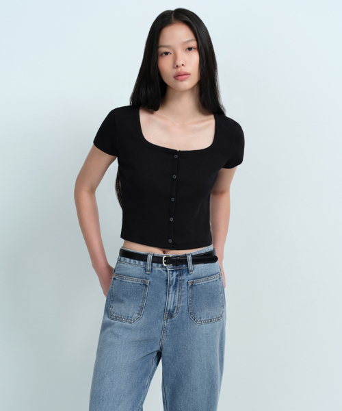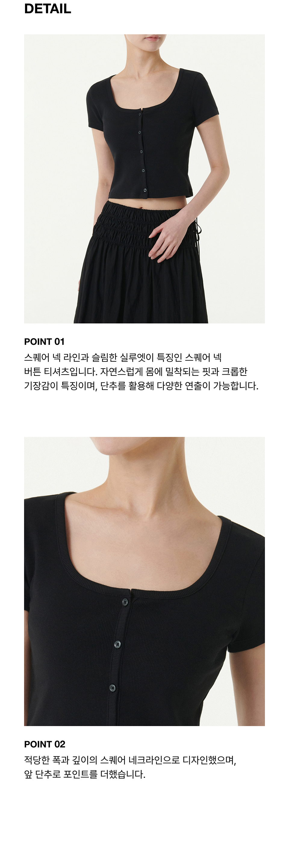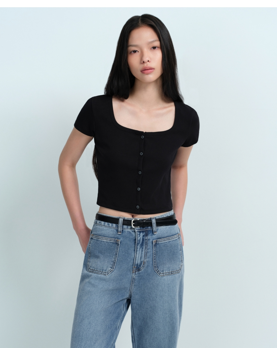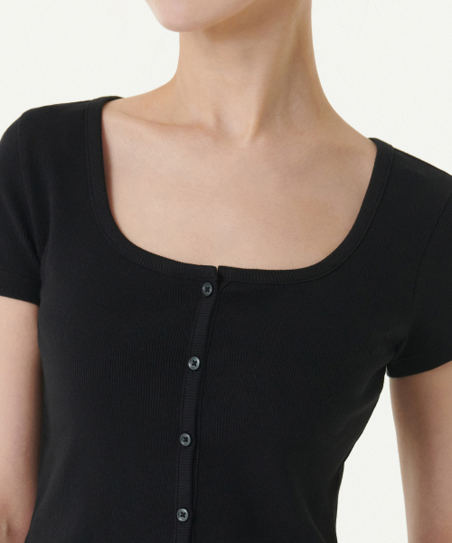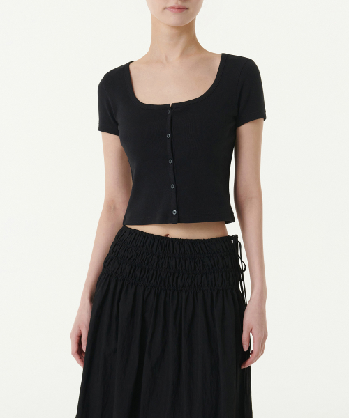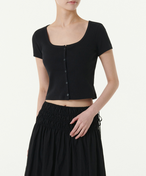 우먼즈 슬림 크롭 스퀘어 넥 버튼 티셔츠 [블랙]