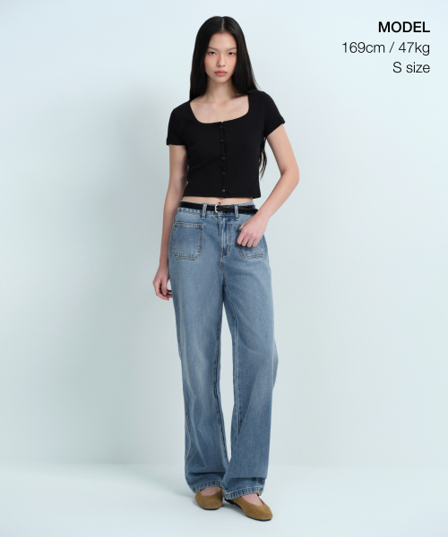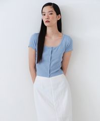 우먼즈 슬림 크롭 스퀘어 넥 버튼 티셔츠 [클라우디 블루]