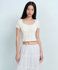 우먼즈 슬림 크롭 스퀘어 넥 버튼 티셔츠 [크림]
