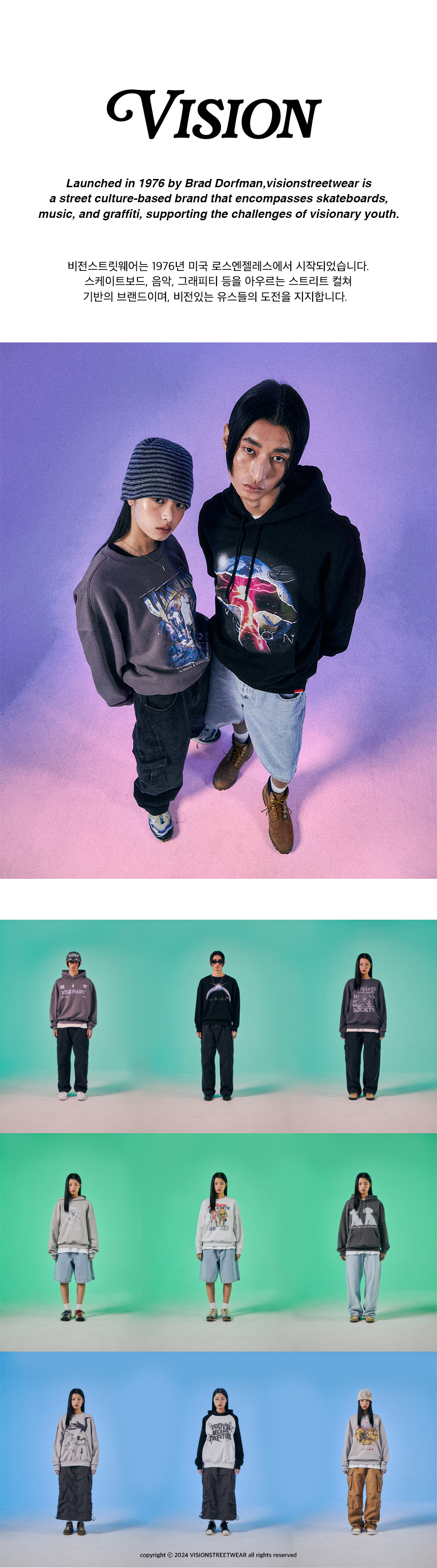 비전스트릿웨어(VISION STREETWEAR)는 1976년, 미국 LA에서 론칭한 스트릿 컬처 기반의 브랜드입니다. 스케이트보드와 음악, 그라피티 등의 서브컬처를 아우르며 비전 있는 유스들의 도전을 지지합니다.
