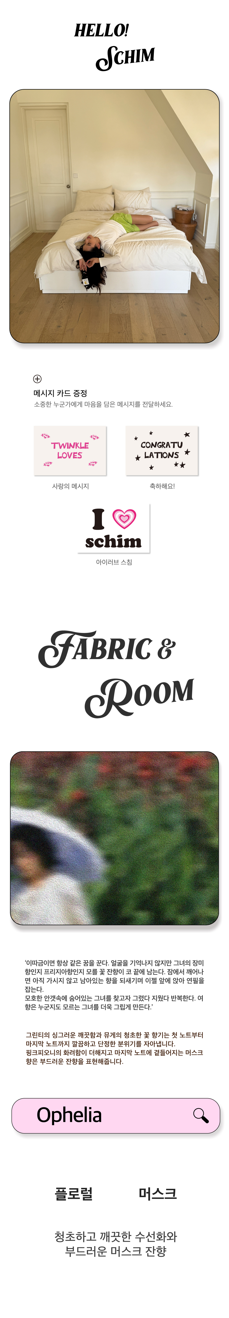 스침(SCHIM)은 향을 어렵지 않게, 쉽고 편하게 다가갈 수 있도록 제품을 만들어갑니다. 각각의 향에서 느껴지는 색감과 재치 있는 일러스트를 통해 한눈에 분위기를 느끼고 경험할 수 있기를 바랍니다.