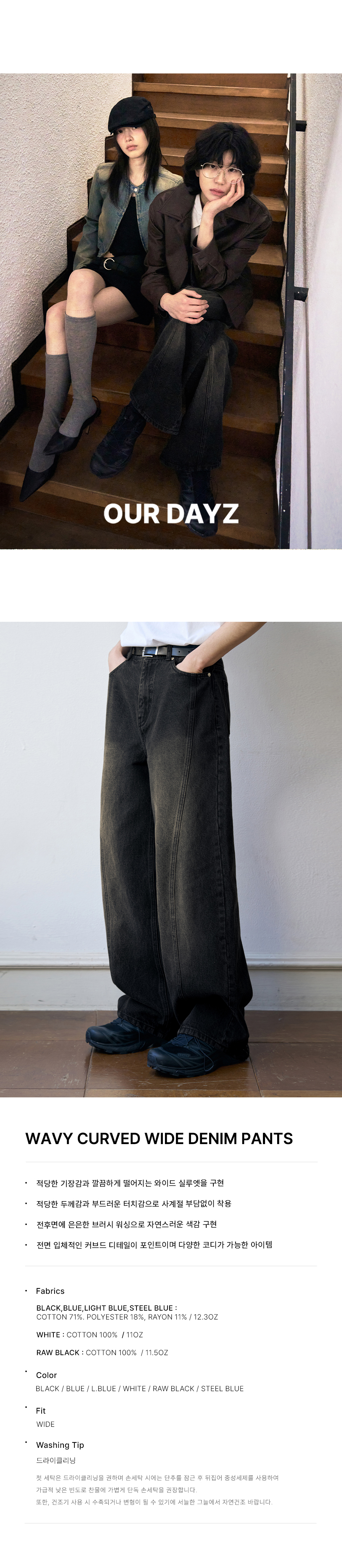 아워데이즈(OURDAYZ)는 편안한 실루엣과 트렌디한 스타일을 전개하는 데님 브랜드입니다. 합리적인 가격과 좋은 품질로 아워데이즈만의 가치를 선보이고자 합니다.