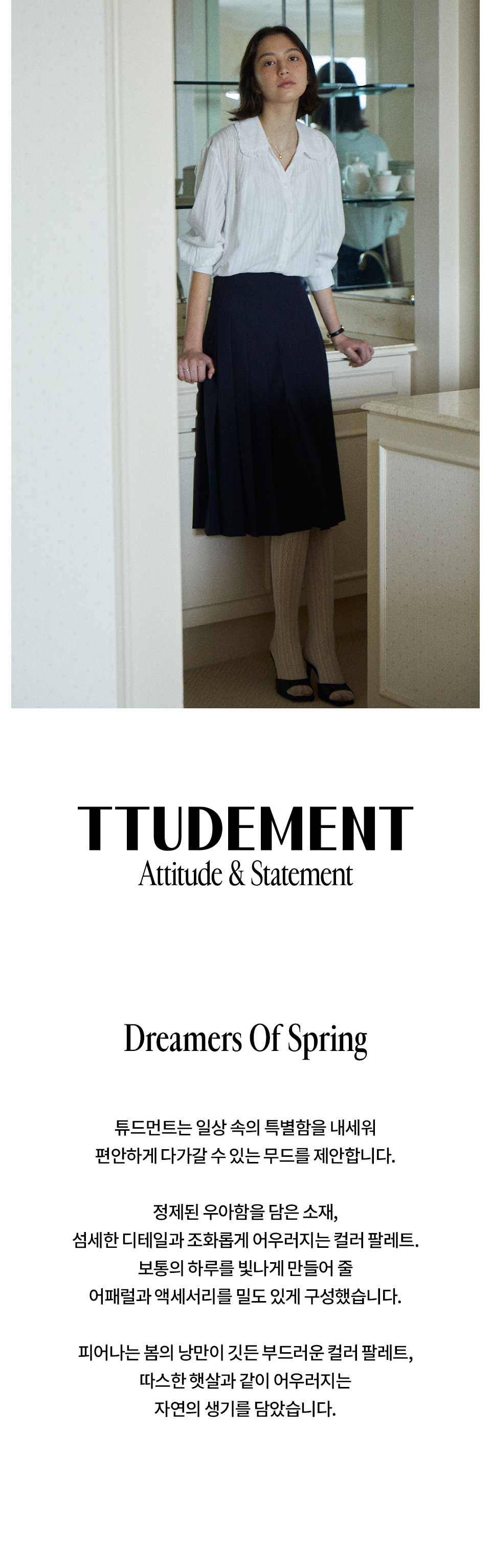 ATTITTUDE & STATEMENT 나만의 태도로 기억되는 브랜드 튜드먼트 입니다. 나이나 유행으로 정의되지 않는, 조용하지만 분명한 태도를 가지고 있는 모습을 담아 가볍고 깨끗한 실루엣, 과하지 않은 로맨틱함으로 완성되는 튜드먼트 만의 이야기를 담아냅니다