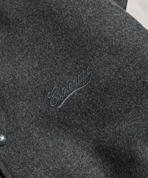 - 블랭크 무드의 디자인을 살려 가슴 쪽에 모직 원단의 컬러에 맞춰 자수로 새겨진 스크립트 로고 그래픽