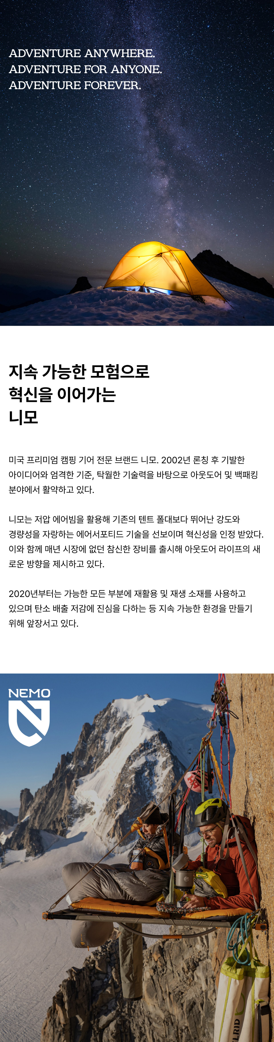 니모(NEMO)는 미국 프리미엄 캠핑 기어 전문 브랜드입니다. 지금껏 누구도 만들지 못했던 편리한 제품을 디자인합니다. 더 많은 시간과 체력을 탐험과 휴식에 전념하고 지속 가능한 환경이 유지될 수 있도록 탄소 배출 저감에 진심인 프리미엄 캠핑 기어 브랜드입니다.
