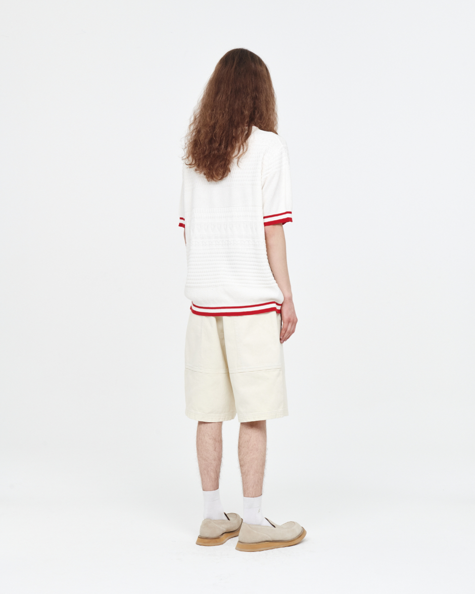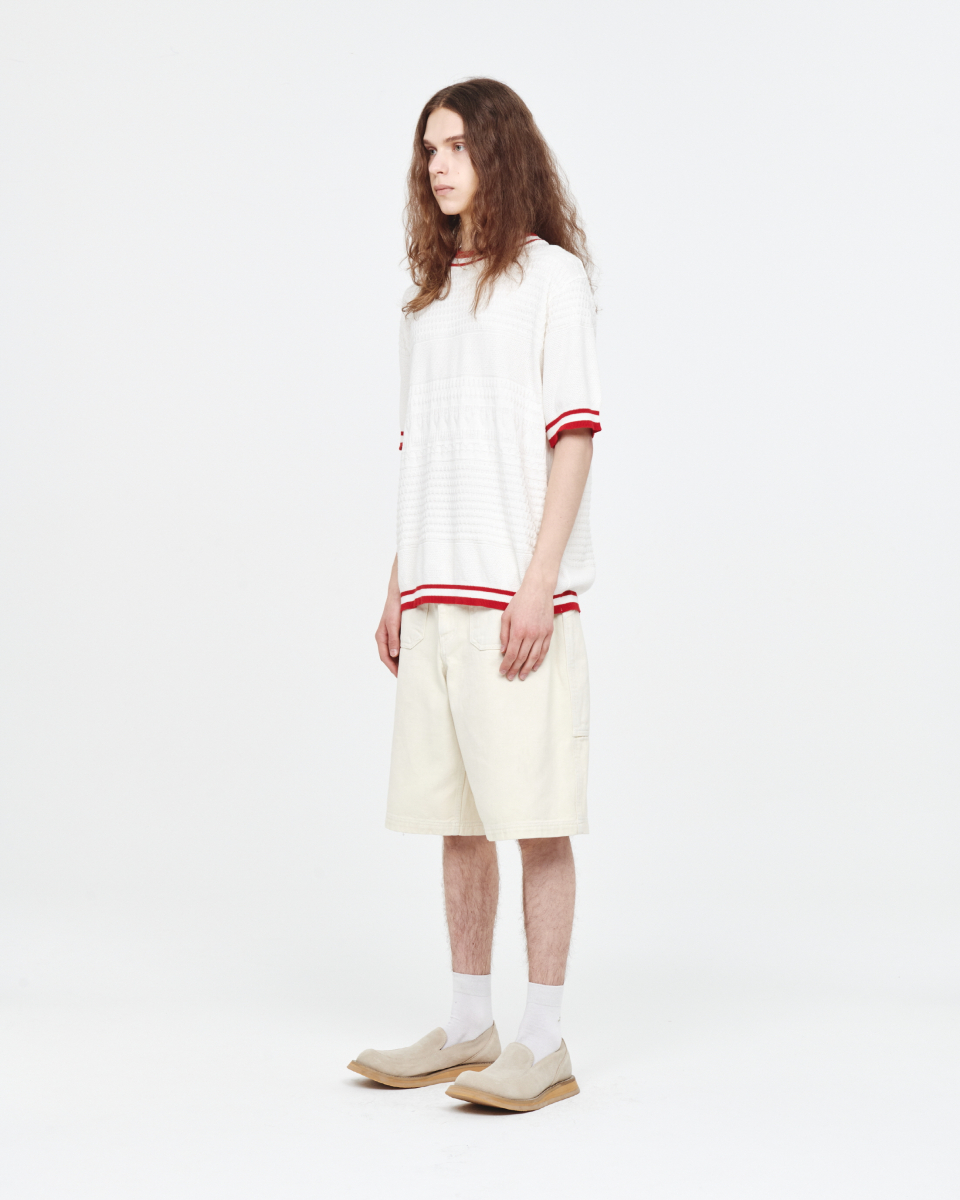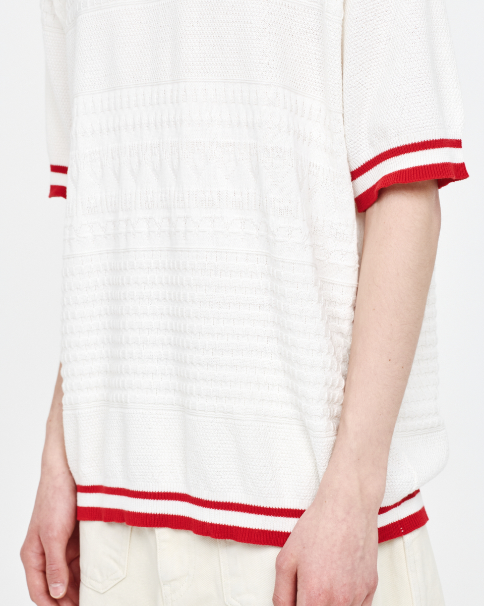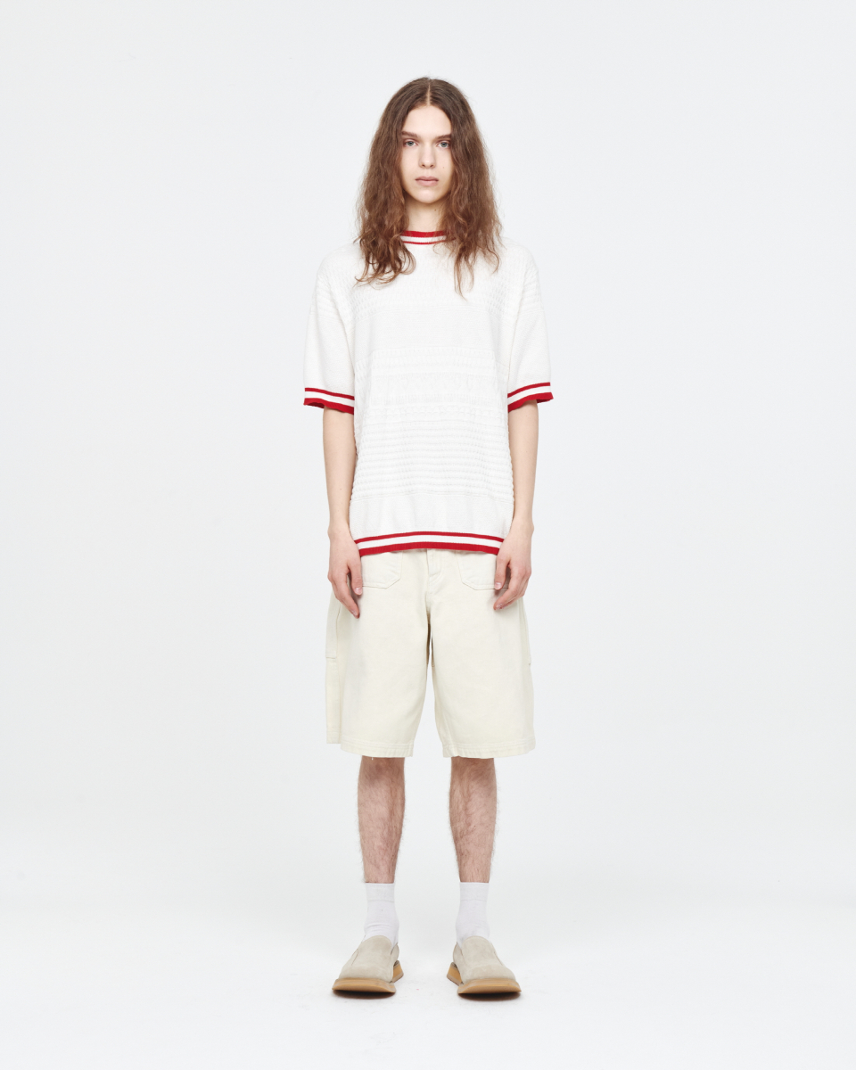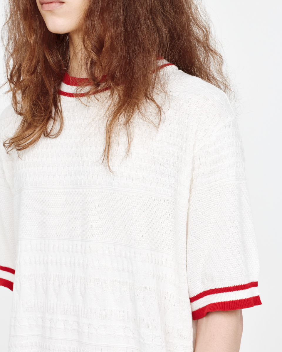 7게이지의 산뜻한 분위기의 자카드 편직으로 디자인된 크루넥 니트. 네크와 소맷단, 밑단의 스트라이프 배색이 특징. 은은하고 고급스럽게 표현된 자카드 디테일. 캐주얼한 룩에 다양하게 믹스 매치할 수 있는 매력적인 아이템.