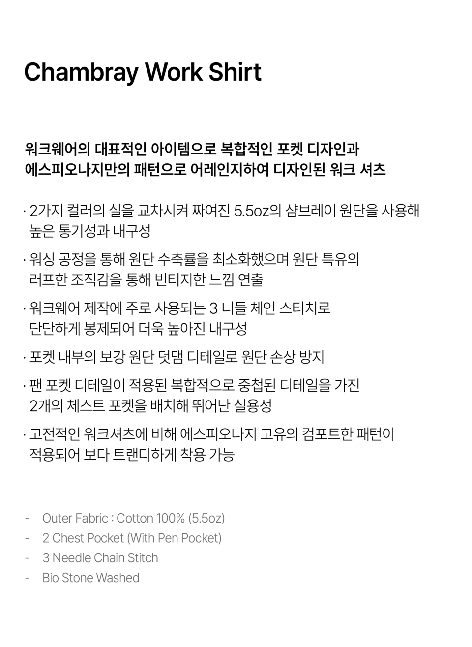 에스피오나지(ESPIONAGE)는 '밖을 보다' '숨겨져 있는 것을 발견한다'는 의미의 고대 프랑스어 ESPIRE에서 유래한 말로 지금은 타국의 비밀 정보를 수집하는 첩보 활동을 뜻하기도 합니다. 첩보 활동의 의미가 적진에서 은밀히 적들의 정보를 빼오는 것을 말하는 것처럼 에스피오나지가 만드는 아이템에는 숨겨져 있는 것을 찾아내는 과정을 포함하고 있습니다. 클래식, 밀리터리, 아웃도어 등 이미 만들어져 있는 의복을 베이스로 우리가 중요하게 생각하는 원단과 부자재, 기술, 핏 등의 요소들을 정확하게 탐구하고 수집해 조합, 재정의 혹은 재해석된 결과물을 만들고자 합니다. 사전적인 의미의 에스피오나지가 가지는 부정적인 첩보 활동의 이미지가 아닌 첩보 활동의 과정, 즉 본질에 대한 탐구와 조사 활동이라는 긍정적인 느낌을 전달하려 하며 수집된 정보를 하나의 작업물로 만들어내는 일련의 과정과 그렇게 완성한 에스피오나지의 아이템을 통해 다시 만드는 과정을 다시 유추하려는 생각들 모두 에스피오나지입니다.