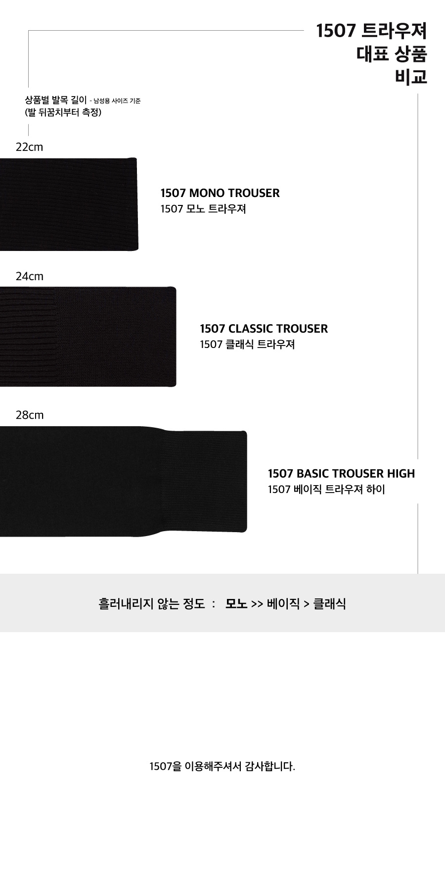 1507(일오공칠)은 그 시작인 창고 번지수 '1507'을 의미하며, 다양한 라이프스타일을 가진 사람들의 요구를 적극적으로 반영하고 그들의 더 나은 삶을 위해 노력하는 브랜드입니다. 2대에 걸친 양말 제작의 노하우로 높은 품질과 심플한 디자인의 양말을 제작하며, 우수한 품질과 합리적인 가격의 언더웨어를 제공합니다. 품질에만 집중하여 최소의 디자인으로 최대 퀄리티의 상품을 제작합니다.