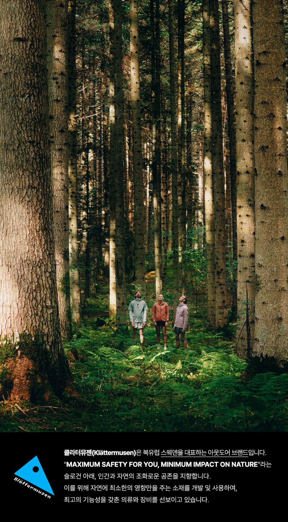 클라터뮤젠(KLATTERMUSEN)은 북유럽을 대표하는 스웨덴의 패션&라이프스타일의 아웃도어 브랜드입니다. 유니크한 디자인과 엄선된 친환경 소재만을 사용해 최고의 기능성과 신뢰성을 바탕으로 제작된 의류와 장비를 만듭니다. "인간에게는 최대의 안전을, 자연에게는 최소한의 영향을"이란 슬로건처럼 인간과 자연의 조화로운 공존을 지향합니다.