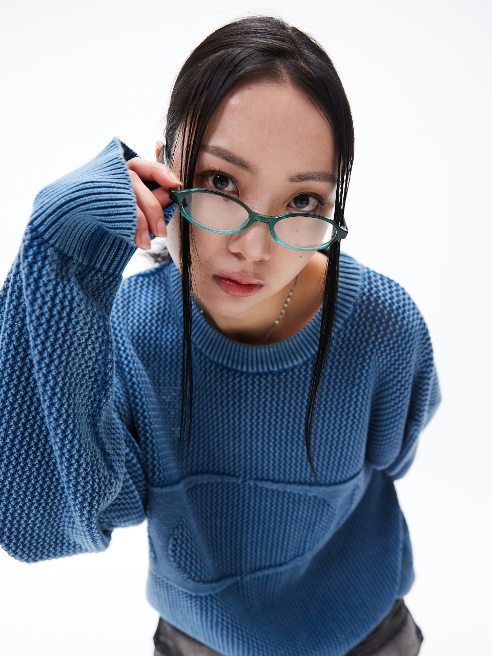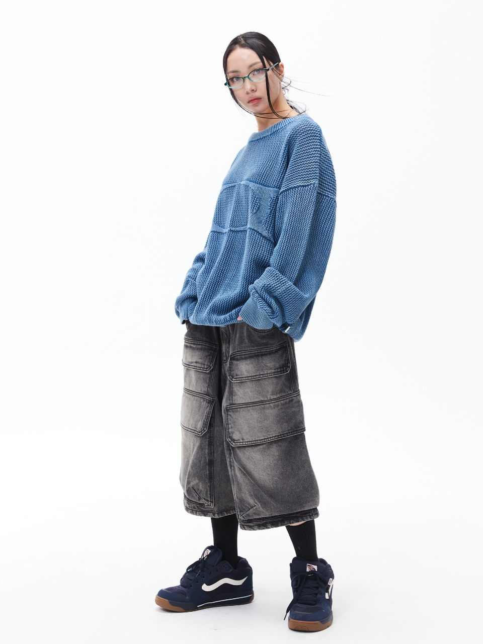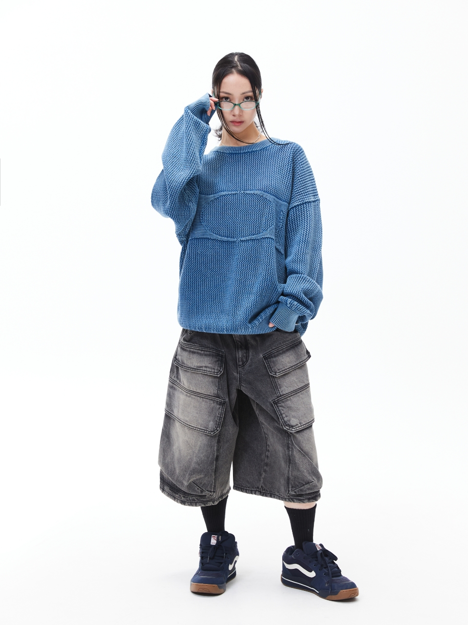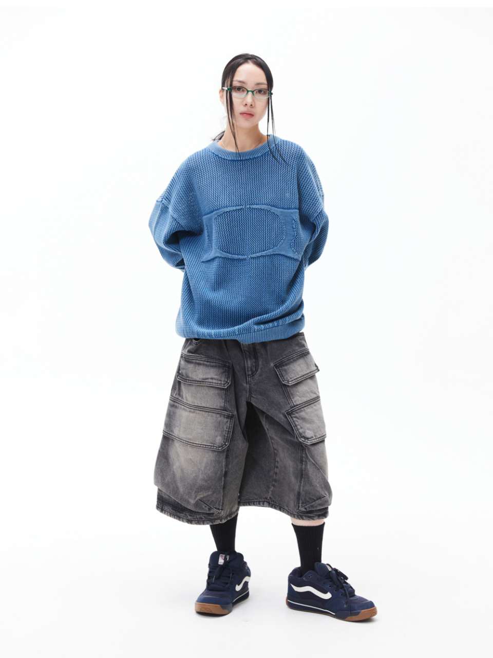 헤어리 그래픽 로고 오버핏 자카드 니트 (BLUE)