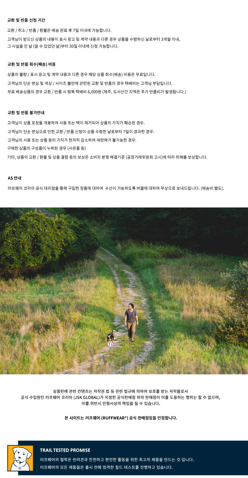 러프웨어(RUFFWEAR)는 그 이름만으로도 애견용품을 대표하는 최고급 브랜드로 미국 오리건주 밴드에 위치했습니다. 러프웨어의 철학은 개와 사람이 동료애를 느끼며 아웃도어 활동을 안전하고 편안하게 할 수 있는 최고급 아웃도어 애견용품을 만드는 것이며, 이를 위해 제품의 디자인, 소재를 그 목적에 맞게 설계/제작하고 있으며 지속적인 제품 개발을 통해 최고의 애견용품 업체로의 위상을 굳건해 하고 있습니다.