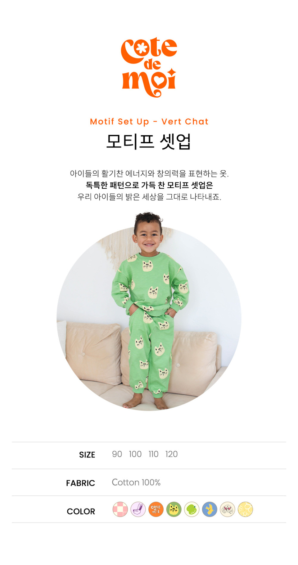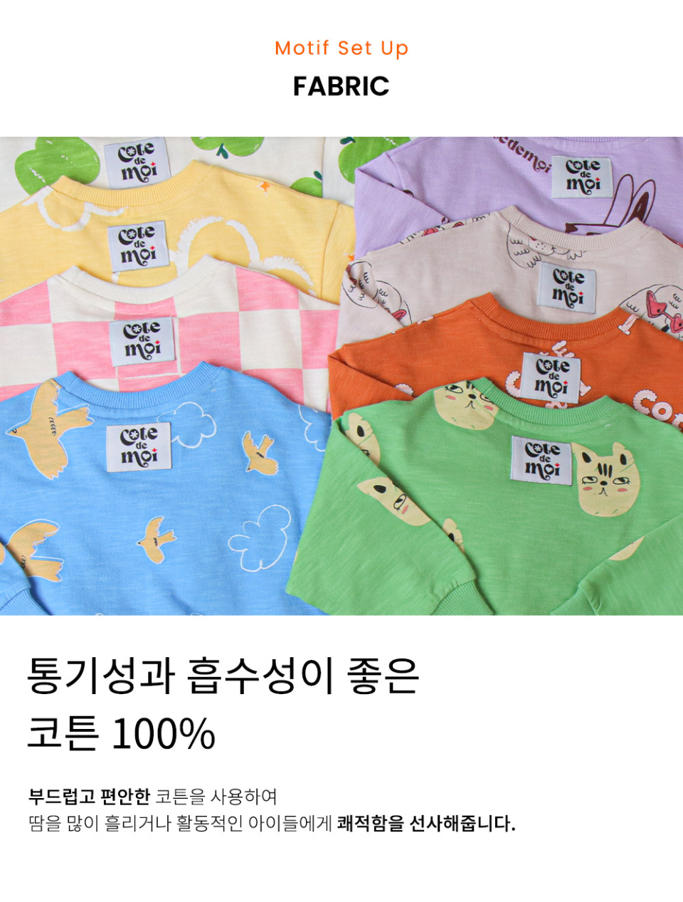 꼬떼드무어(COTE DE MOI)는 '내 옆에'라는 뜻을 담고 있습니다. 아이들과의 모든 순간을 함께하고자 하는 마음을 담아 디자인한 브랜드입니다.