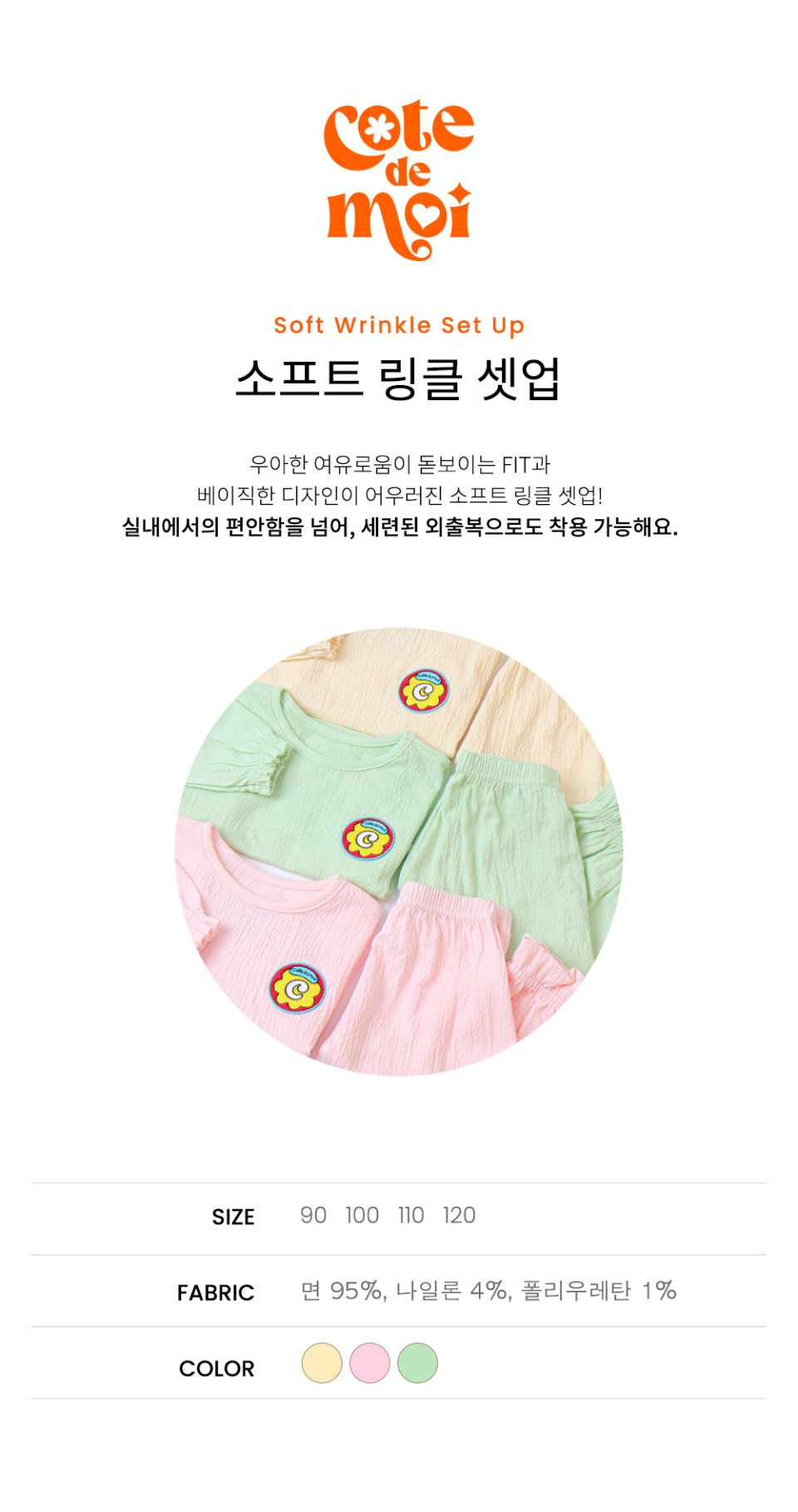 꼬떼드무어(COTE DE MOI)는 '내 옆에'라는 뜻을 담고 있습니다. 아이들과의 모든 순간을 함께하고자 하는 마음을 담아 디자인한 브랜드입니다.