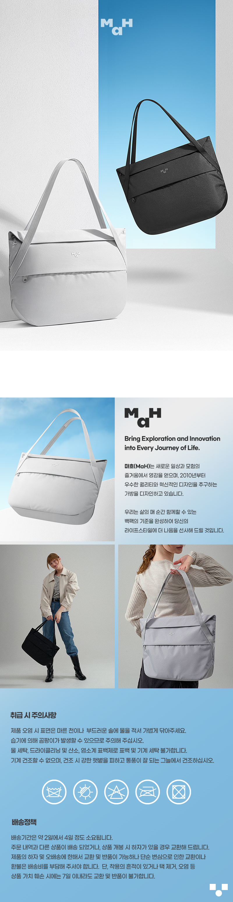 마흐(MAH)는 디자인과 실용성의 균형을 바탕으로 여행의 감성과 일상의 편안함을 함께 담은 가방을 제안하는 패션 가방 브랜드입니다.