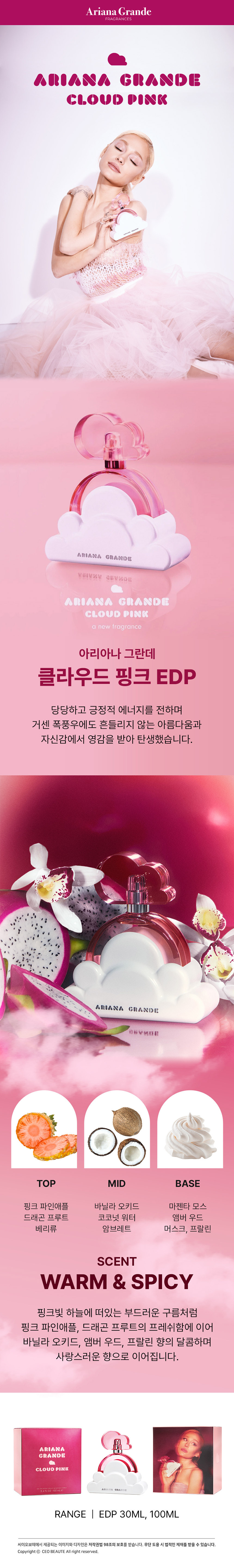 아리아나 그란데(ARIANA GRANDE)는 파워풀한 목소리와 유니크한 스타일로 음악 산업을 장악한 멀티 플래티넘 싱어송라이터 아리아나 그란데(Ariana Grande)의 프래그런스 브랜드입니다. 젊고 당당하지만 따뜻한 사랑으로 전 세계 팬들과 소통하고 있습니다. 그녀의 아이덴티티를 고스란히 담아낸 프래그런스를 선사합니다.