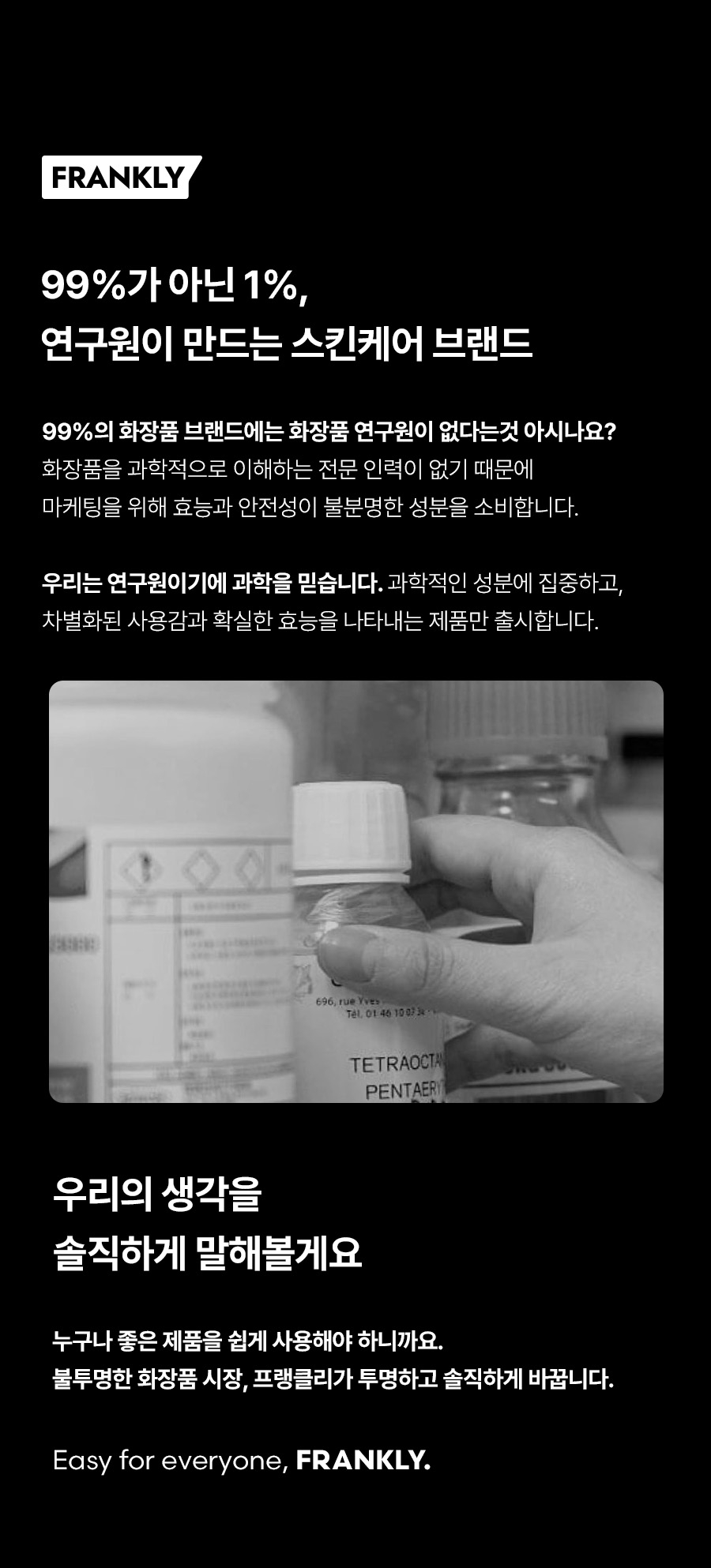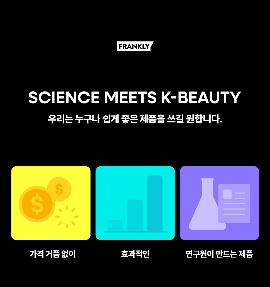 프랭클리(FRANKLY)는 누구나 쉽게 좋은 제품을 접하게 만들기 위해, 화장품 연구원들이 만든 브랜드입니다.