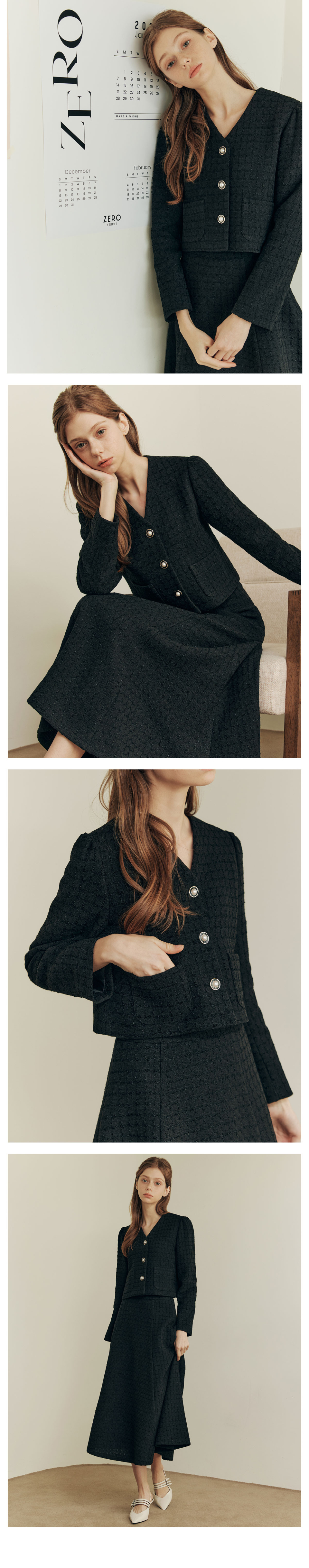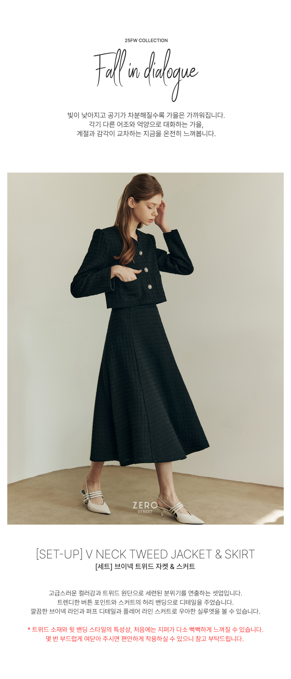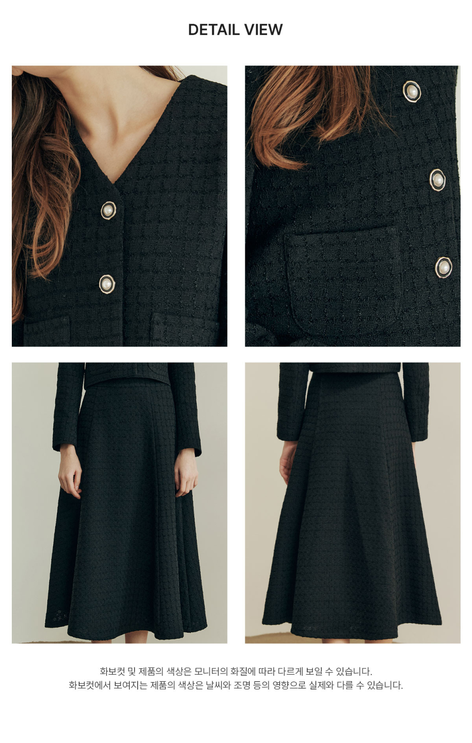 [세트] 브이넥 트위드 자켓 & 스커트 / 솔리드 블랙