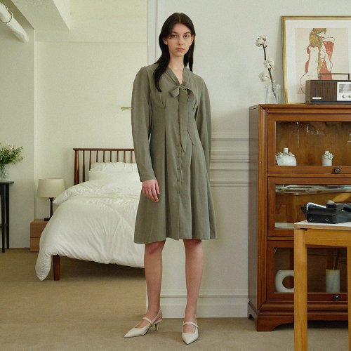 원 사이드 버튼 퍼프 롱 원피스 - 베이지