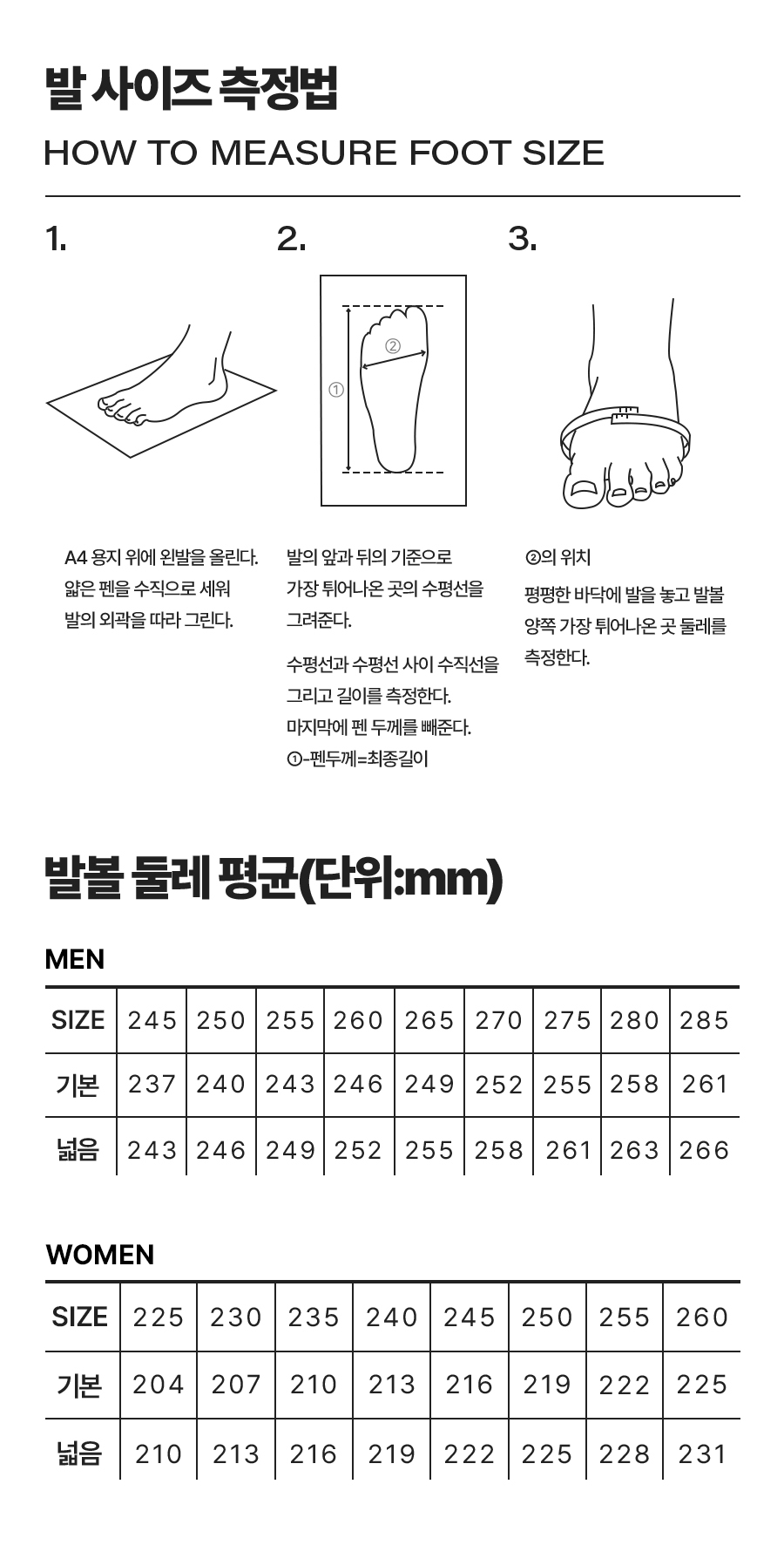 발볼이 넓거나 발등이 높은 경우에는 반 치수 업을 추천드립니다.