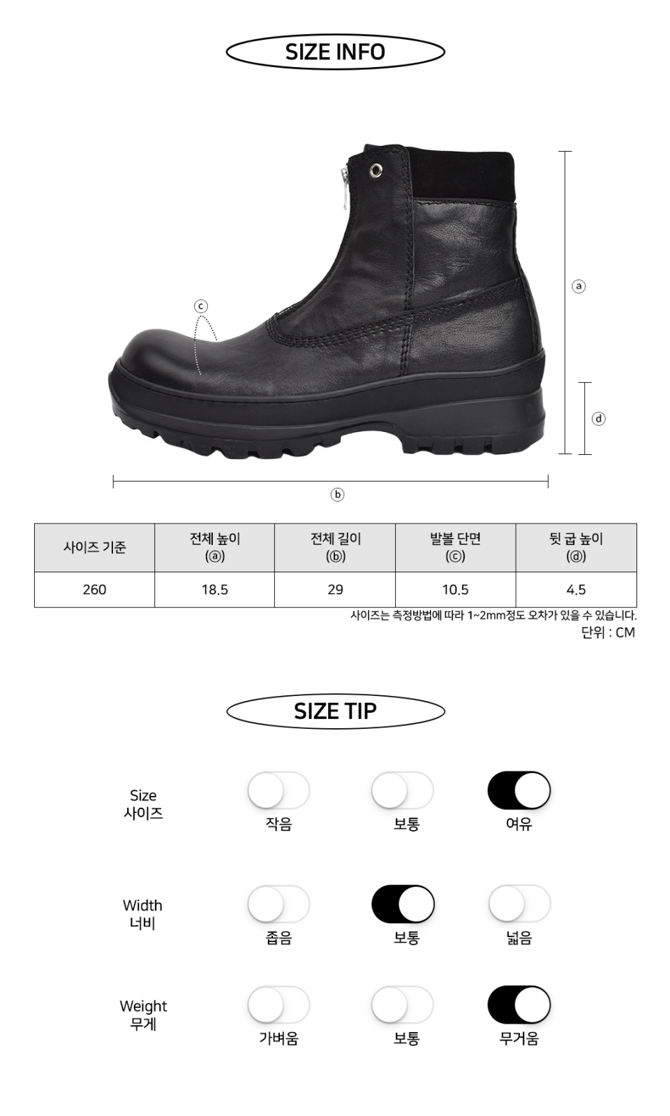 해당 제품은 여유 있게 제작된 모델입니다. 다만 부츠 특성상 발볼과 발등뿐만 아니라 발목 부분의 착용감도 함께 고려하여 사이즈 선택을 하시는 것을 추천드립니다.