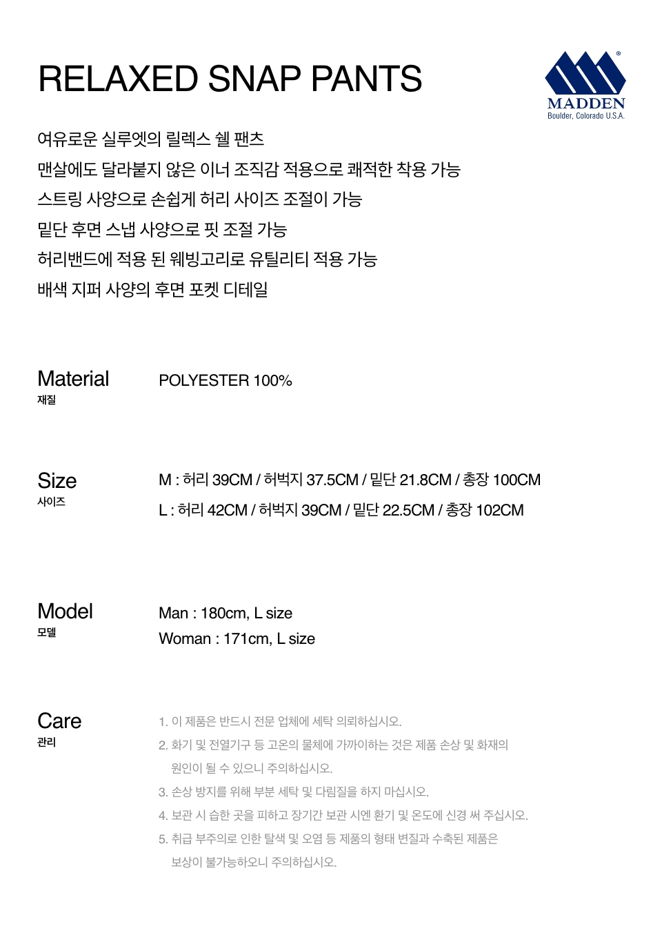매든(MADDEN)은 1974년 COLORADO주의 BOULDER에서 DAN MADDEN(댄 매든)에 의해 창립되었으며, 많은 시간동안 다양한 스타일의 제품으로 아웃도어 매니아들과 소통해왔습니다. 2023년 더욱 발전된 모습으로 캠핑, 하이킹, 싸이클링 등 다양한 아웃도어 활동에서 영감을 받아 언제 어디서나 편안하게 착용할 수 있는 라이프스타일 웨어 브랜드로 재 탄생하였습니다. 브랜드의 헤리티지, 트렌드와 실용적이고 기능적인 디테일을 연구해 적용한 디자인으로 매 시즌마다 새로워진 매든(MADDEN)으로 누구나 착용할 수 있는 패션을 선보입니다. "Simple, Daily, Steady Seller Style, Durable More Than Any Brand”