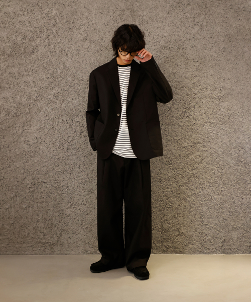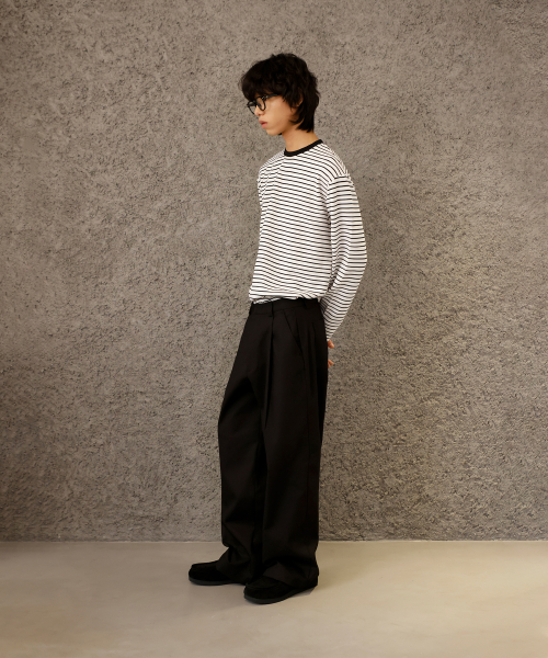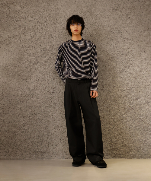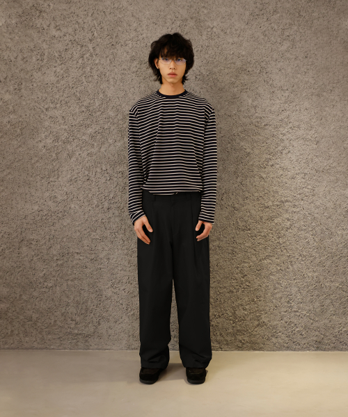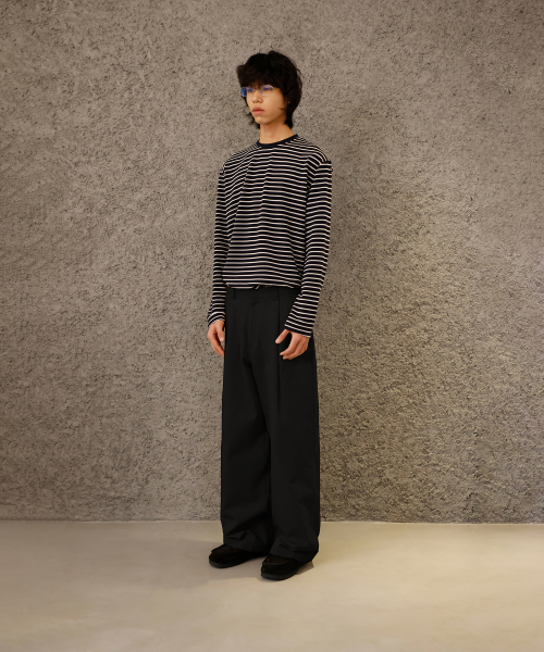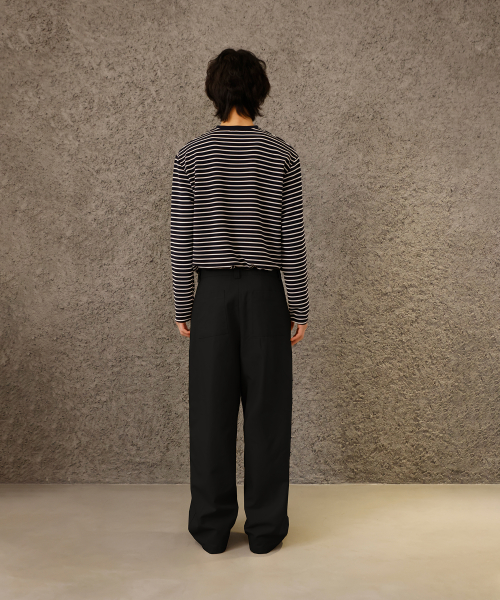 블랙 커브드 절개라인 와이드 코튼 팬츠