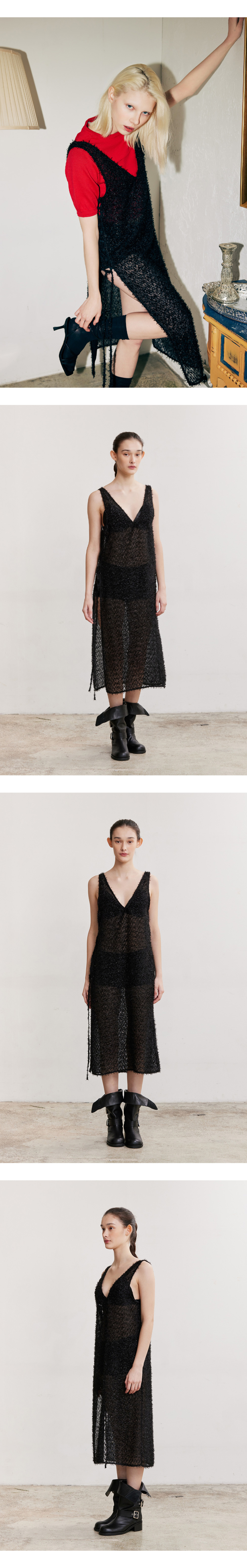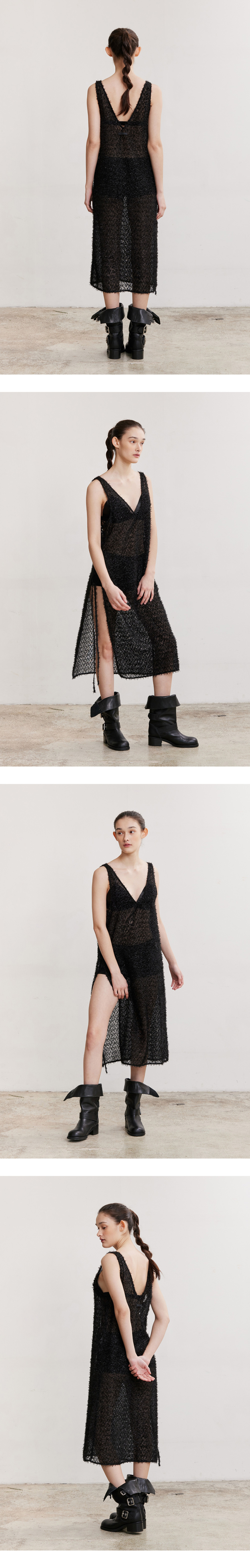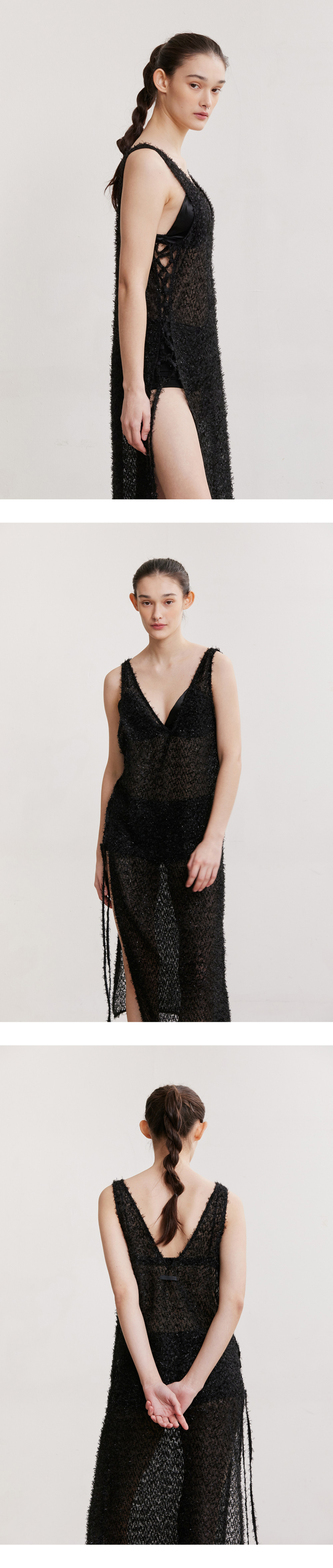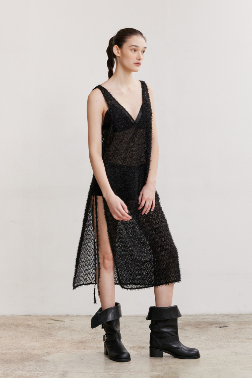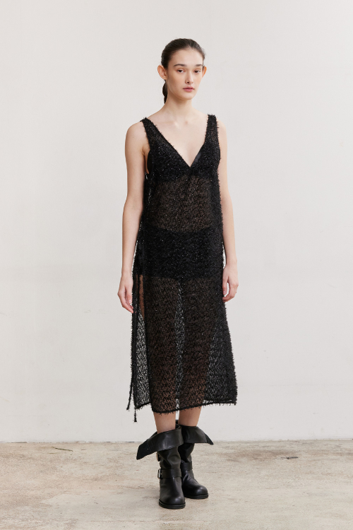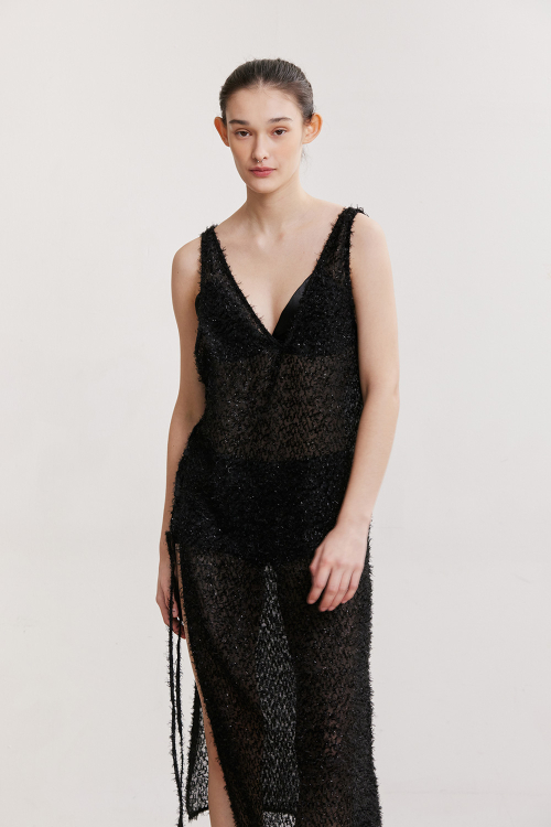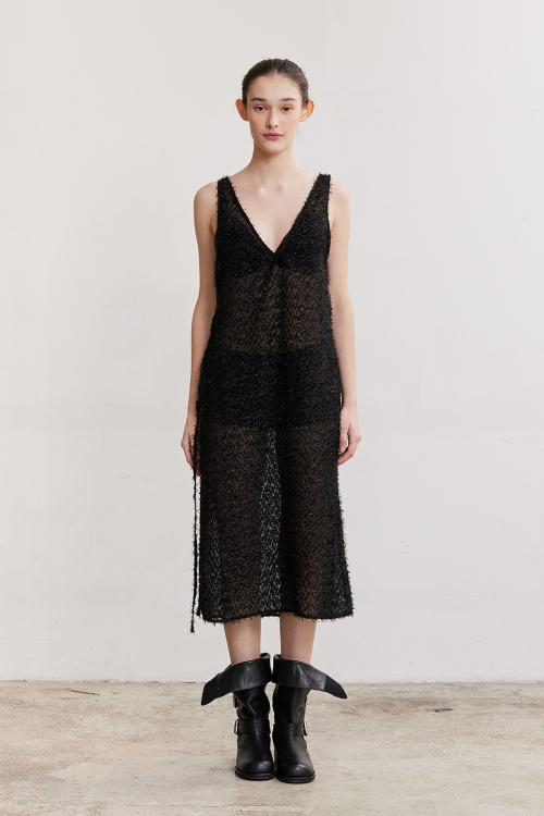 - 시스루 소재에 은은한 글리터 장식을 더한 깊게 파인 브이넥 디자인의 원피스입니다.