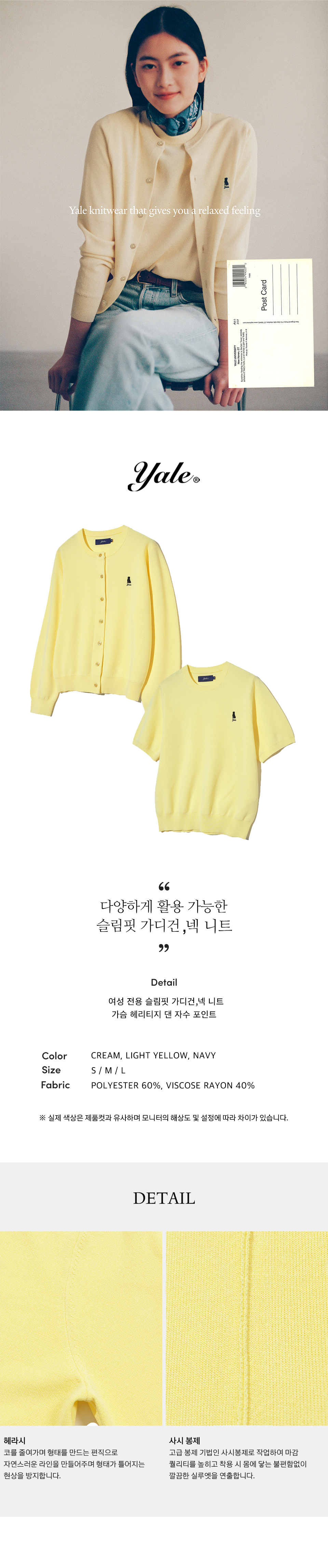 예일(YALE)은 'Make Your Mark'를 슬로건으로, 예일의 전통과 지성을 패션에 담아 시대를 초월한 가치와 품격을 제공하는 브랜드입니다. 전통과 현대, 남성과 여성, 캐주얼과 포멀의 경계를 허물며, 새로운 가능성을 제시합니다. 전통적인 프레피 룩을 현대 트렌드에 맞춰 재해석한 ‘뉴 프레피 스타일’ 을 통해 자연스럽고 감각적인 스타일을 선보입니다. 또한, 다양한 제품들과 조화롭게 어우러질 수 있는 레이어링을 목표로 디자인하며, 기존의 옷들과도 완벽하게 어울리는 유연한 스타일을 지향합니다.