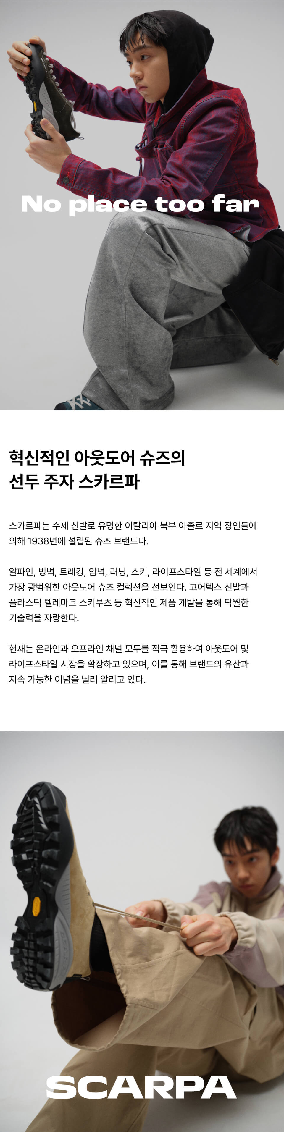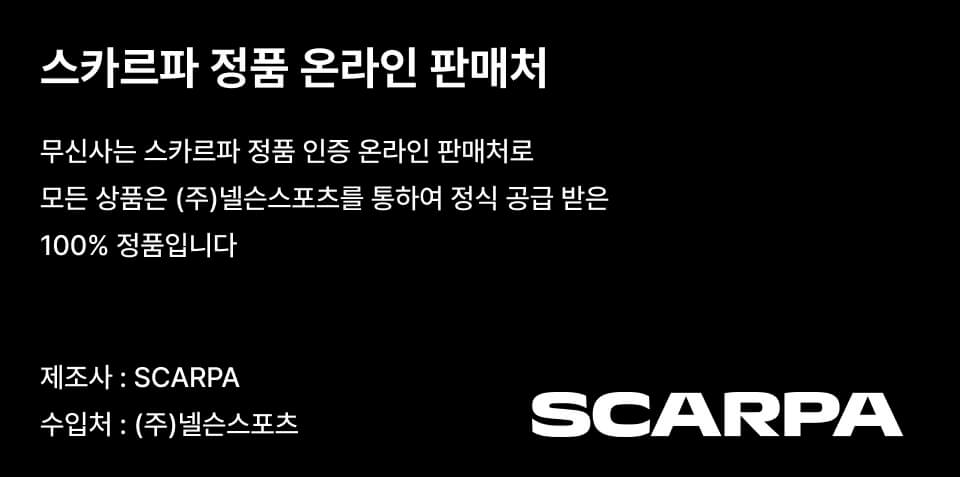 스카르파(SCARPA)는 1938년, 수제 신발로 유명한 이탈리아 북부 아졸로 지역 장인들이 모여 만든 브랜드입니다. 알파인, 빙벽, 트레킹, 암벽, 러닝, 스키, 라이프스타일 등 전 세계에서 가장 광범위한 아웃도어 슈즈 컬렉션을 생산하고 있습니다. 아울러 계속해서 새로운 테크놀로지를 개척하여 혁신적인 기술력의 제품을 선보입니다.