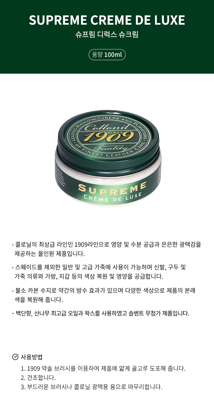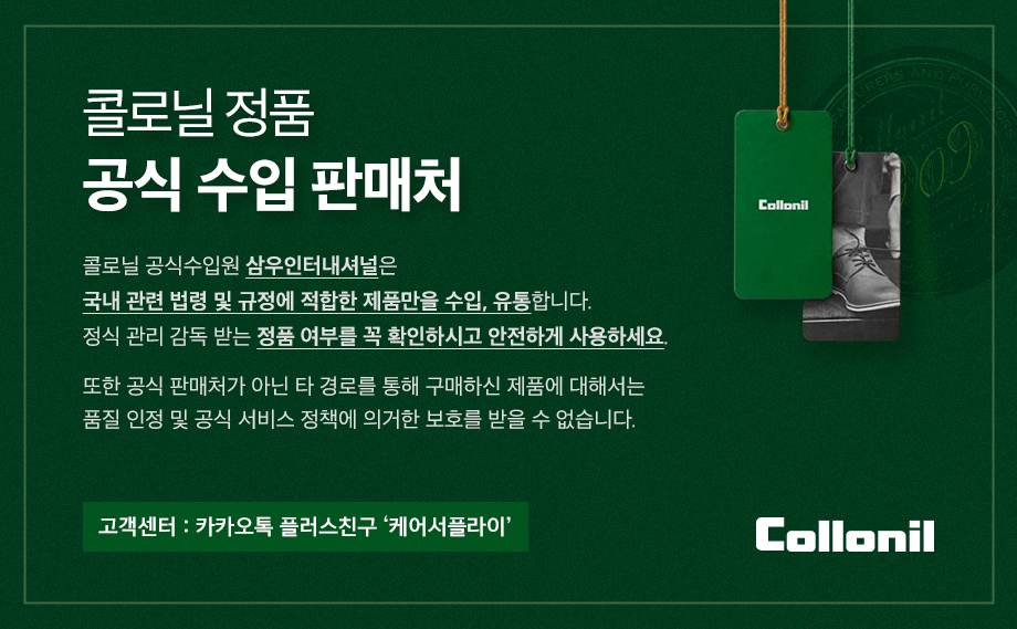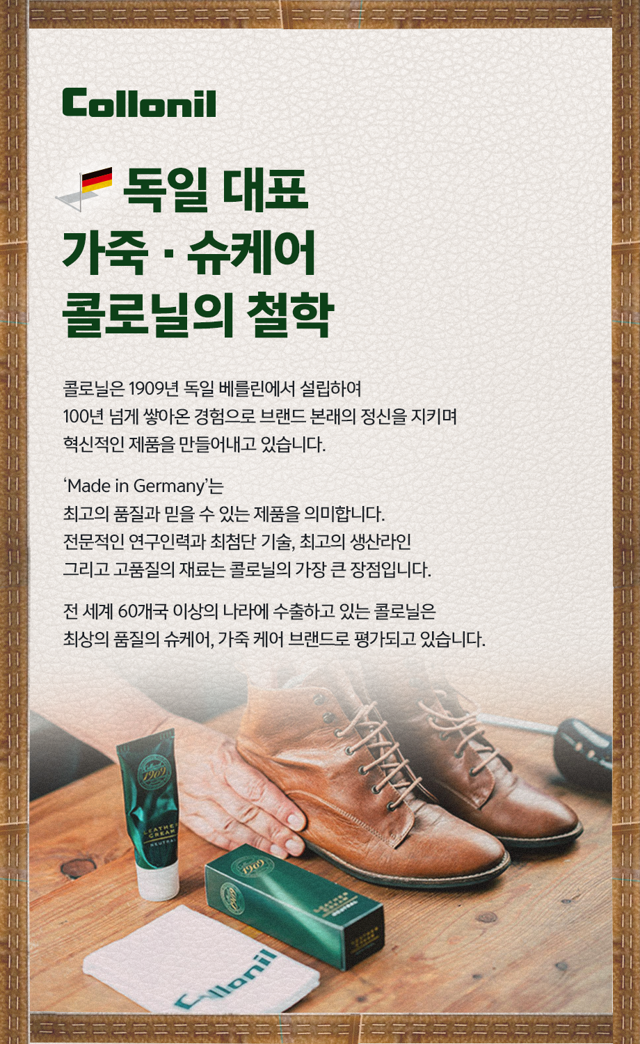 COLLONIL(콜로닐)은 100년이 넘는 자랑스러운 역사를 가진 독일의 콜로닐 브랜드는 최상의 품질의 슈케어, 가죽케어 브랜드로 평가되고 있으며, 구두, 명품백, 가죽으로 된 옷 등의 각종 가죽제품의 노화방지 및 영양공급에 가장 이상적인 상품을 출시하여 선보이고 있는 브랜드입니다.