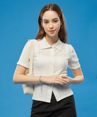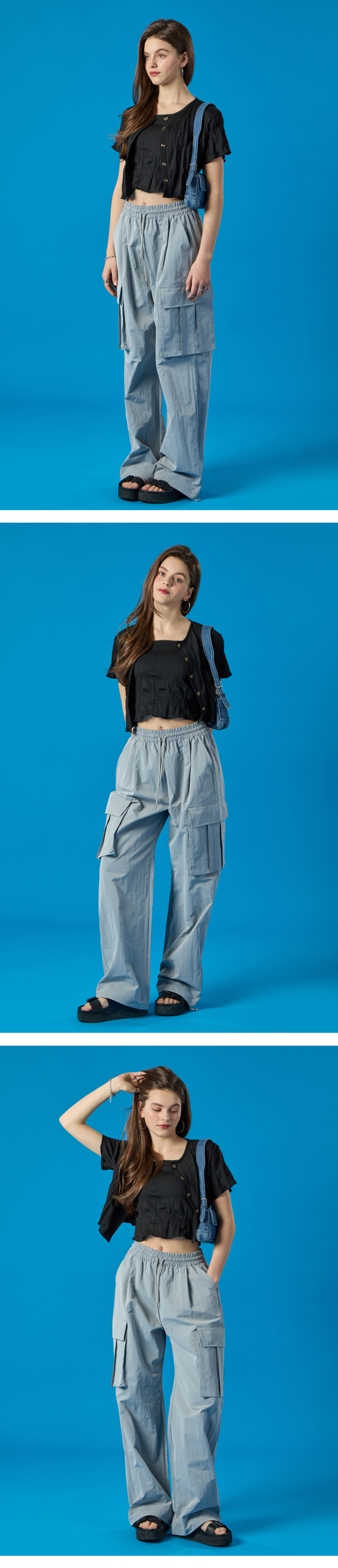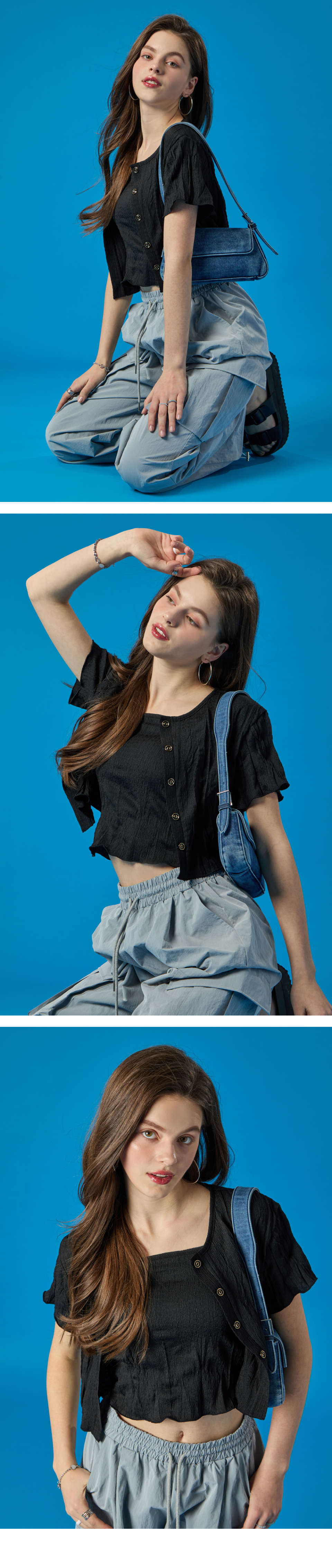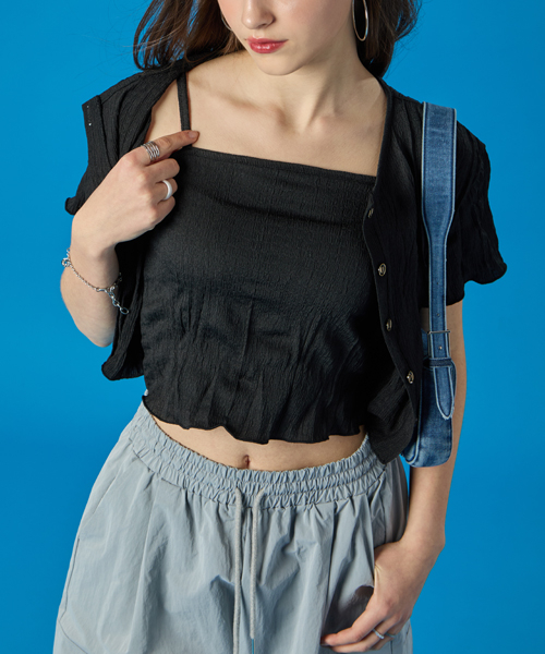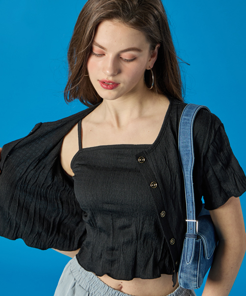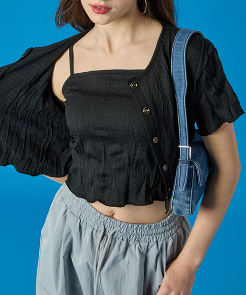 WOMEN 미디 크롭 슬림 플리츠 반팔티 가디건 [WHITE] 반팔 크롭티