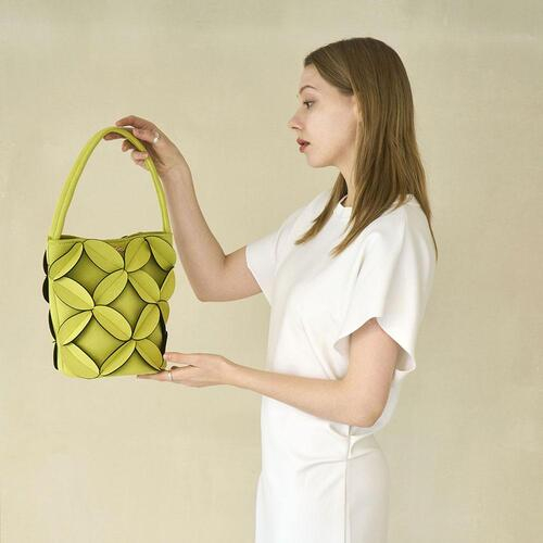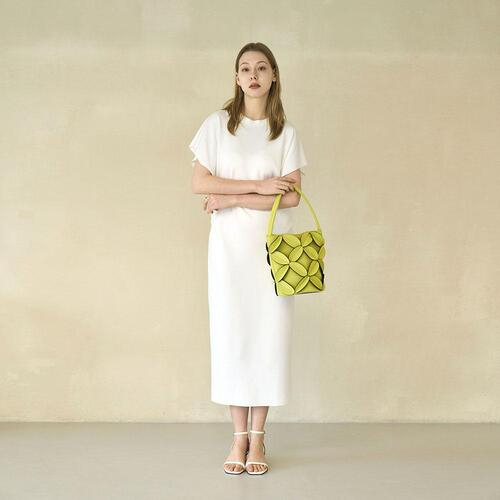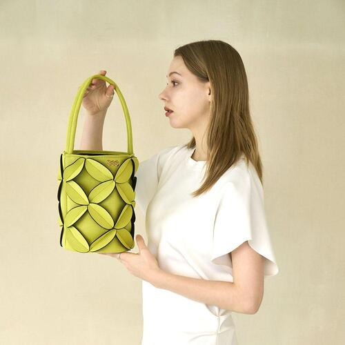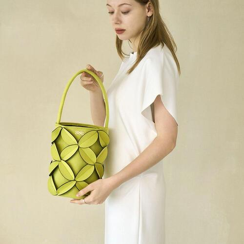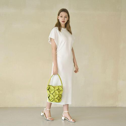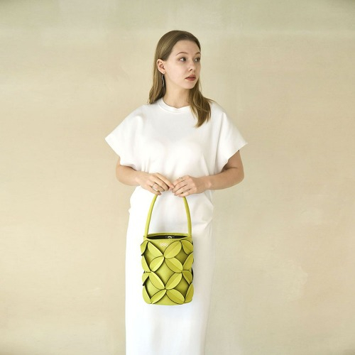 둥그런 원통형 형태의 버킷 백으로 독특한 쉐잎이 돋보이며, 심지를 추가하여 세울 수 있도록 보강하였습니다.