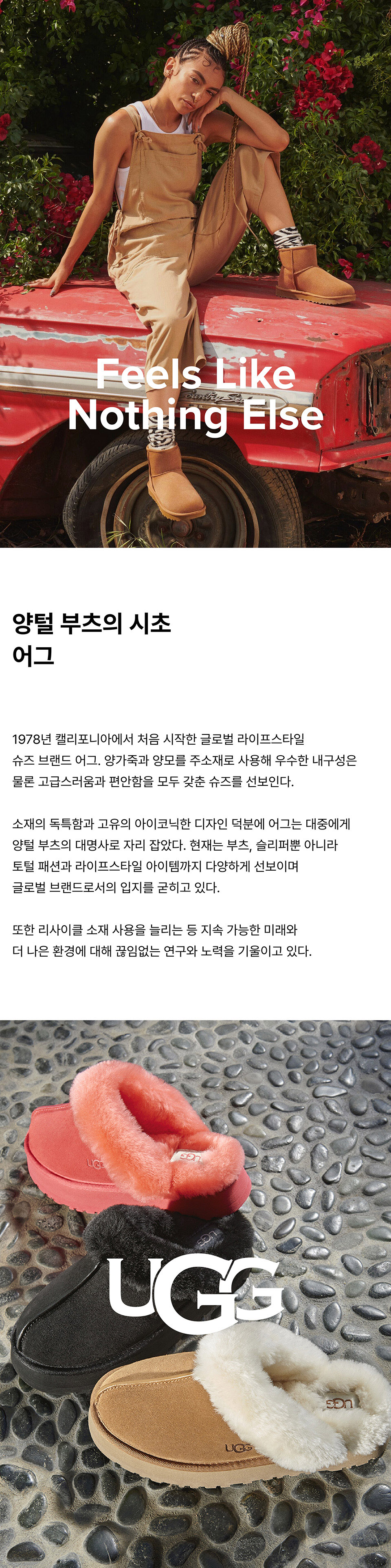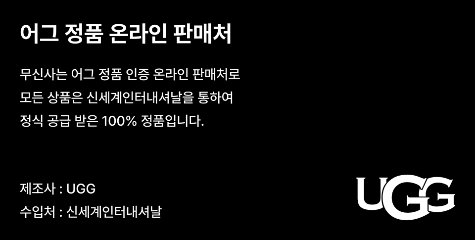 어그(UGG)는 캘리포니아 컨템포러리 라이프스타일 브랜드로 'Feels like nothing else'라는 브랜드 슬로건 아래, 어떤 것과도 비교할 수 없는 뛰어난 품질의 양가죽 슈즈를 선보이는 브랜드입니다. 현재는 슈즈뿐만 아니라 의류, 액세서리, 홈 제품까지 상품군을 확장하여 글로벌 라이프스타일 브랜드로서의 입지를 굳히고 있습니다.
