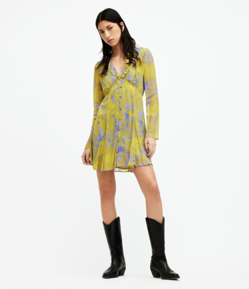 대담한 여름 프린트와 세련된 실루엣이 돋보이는 원피스. 가볍고 주름진 시어 원단으로 섬세하게 제작되었으며, 브이넥 디자인이며, 프릴 디테일과 앞쪽으로 이어지는 단추가 특징입니다. 슬림한 긴소매는 세련된 실루엣을 강조하며, 앞뒤 수직 패널링으로 흐르는 듯한 핏을 구현합니다. 헴라인이 약간 플레어되어 더욱 풍성한 느낌을 줍니다.