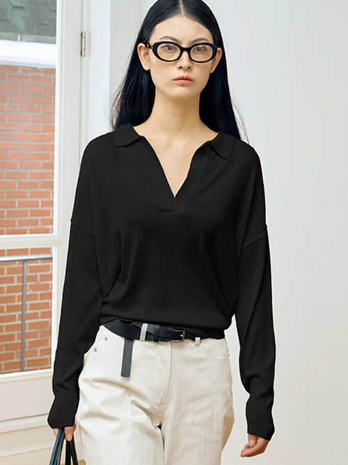 카라 니트 형태의 니트입니다. 쿨링감이 도는 원사로 제작되어 봄,여름 시원하게 착용이 가능합니다.